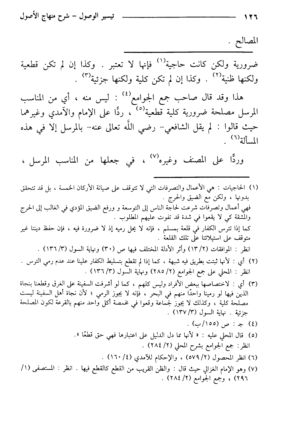 هذا وقد قال صاحب جمع الجوامع: ليس منه، أي من المناسب المرسل مصلحة ضرورية كلية قطعية، رداً على الإمام والآمدي وغيرهما حيث قالوا: لم يقل الشافعي -رضي الله تعالي عنه- بالمرسل إلا في هذه المسألة.