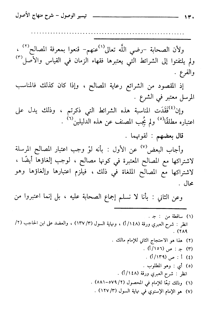 وأجاب البعض عن الأول: بأنه لو وجب اعتبار المصالح المرسلة لاشتراكها مع المصالح المعتبرة في كونها مصالح، لوجب إلغاؤها أيضًا، لاشتراكهما مع المصالح الملغاة في ذلك، فيلزم اعتبارها وإلغاؤها وهو محال.