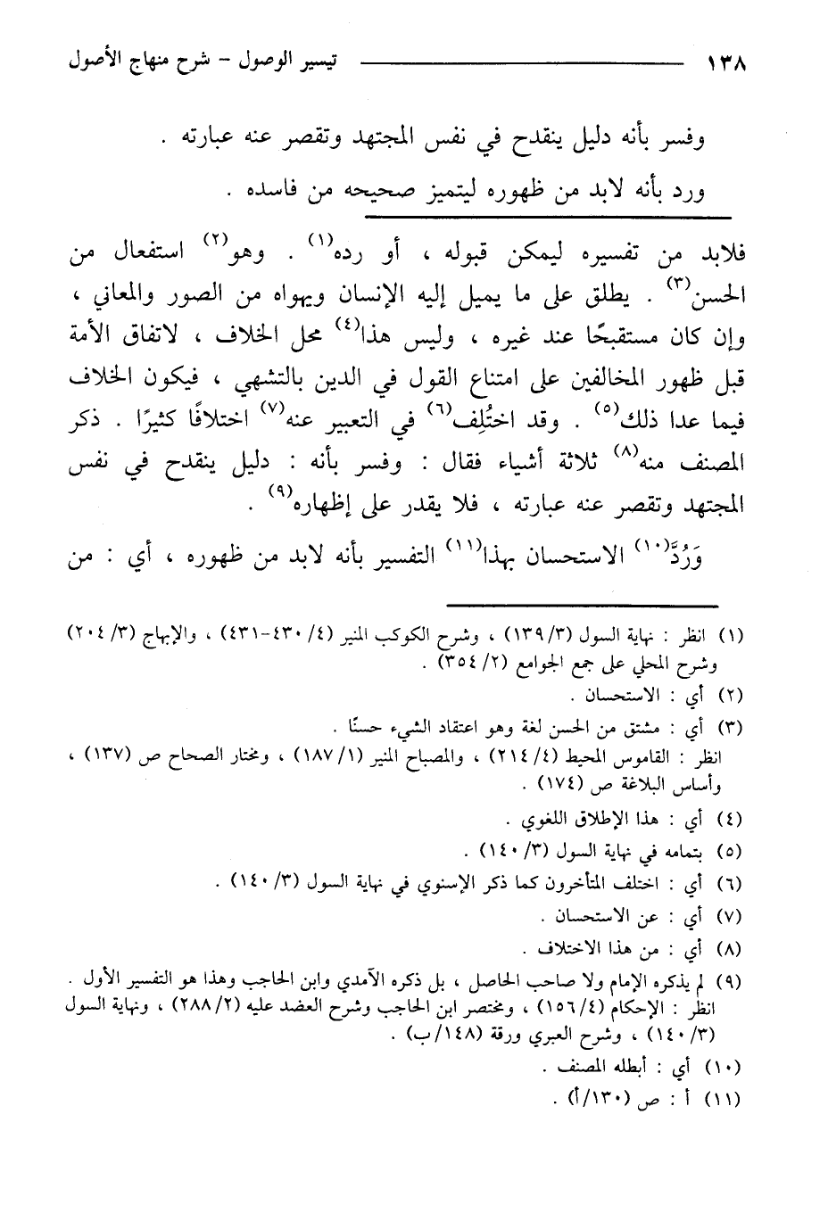 فلا بد من تفسيره ليمكن قبوله، أو رده. وهو استفعال من الحسن. يطلق على ما يميل إليه الإنسان ويهواه من الصور والمعاني، وإن كان مستقبحًا عند غيره، وليس هذا محل الخلاف، لاتفاق الأمة قبل ظهور المخالفين على امتناع القول في الدين بالتشهي، فيكون الخلاف فيما عدا ذلك. وقد اختلف في التعبير عنة اختلاقًا كثيرًا. ذكر المنصف منه ثلاثة أشياء فقال: وفسر بأنه: دليل في نفس المجتهد وتقصر عنه عبارته، فلا يقدر على إظهاره.