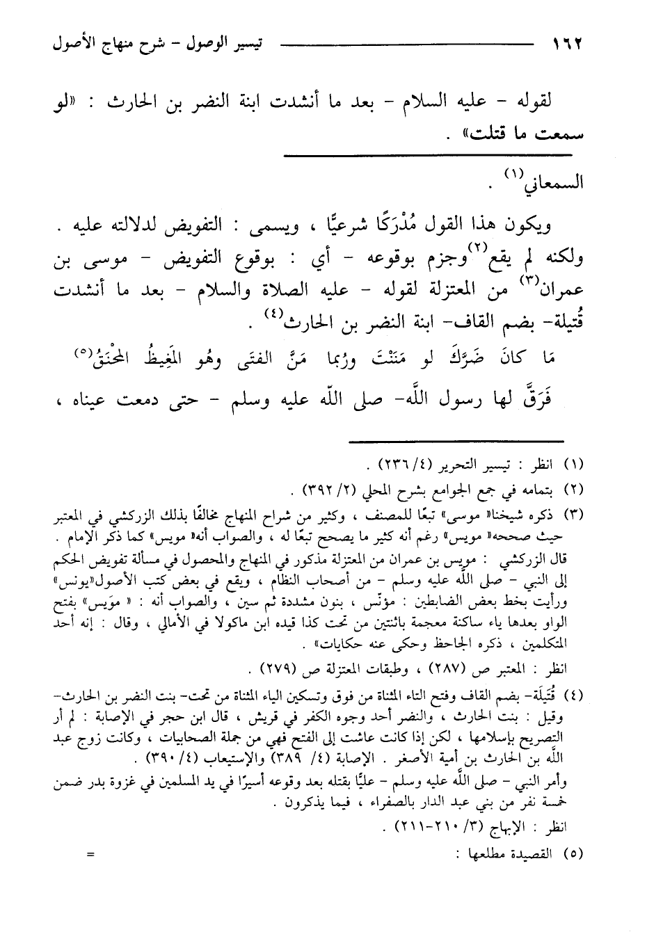 ولكنه لم يقع وجزم بوقوعه- أي: بوقوع التفويض -موسى بن عمران من المعتزلة لقوله -عليه الصلاة والسلام- بعد ما أنشدت قتيلة- بضم القاف- ابنة النضر بن الحارث.