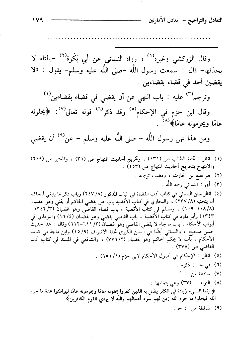 وقال الزركشي وغيره، رواه النسائي عن أبي بكرة -بالتاء لا بحذفها- قال: سمعت رسول الله -صلى الله عليه وسلم- يقول: "لا يقضين أحد في قضاء بقضاءين.