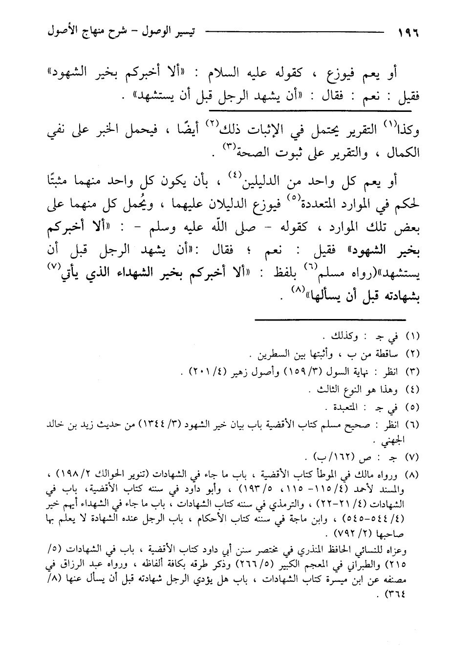 أو يعم كل واحد من الدليلين، بأن يكون كل واحد منهما مثبتًا لحكم في الموارد المتعددة فيوزع الدليلان عليهما، ويحمل كل منهما على بعض تلك الموارد المتعددة فيوزع الدليلان عليهما، ويحمل كل منهما على بعض تلك الموارد، كقوله -صلى الله عليه وسلم-: "ألا أخبركم بخير الشهود" فقيل: نعم؛ فقال: "أن يشهد الرجل قبل أن يستشهد" (رواه مسلم بلفظ: "ألا أخبركم بخير الشهداء الذي يأتي بشهادته قبل أن يسألها".