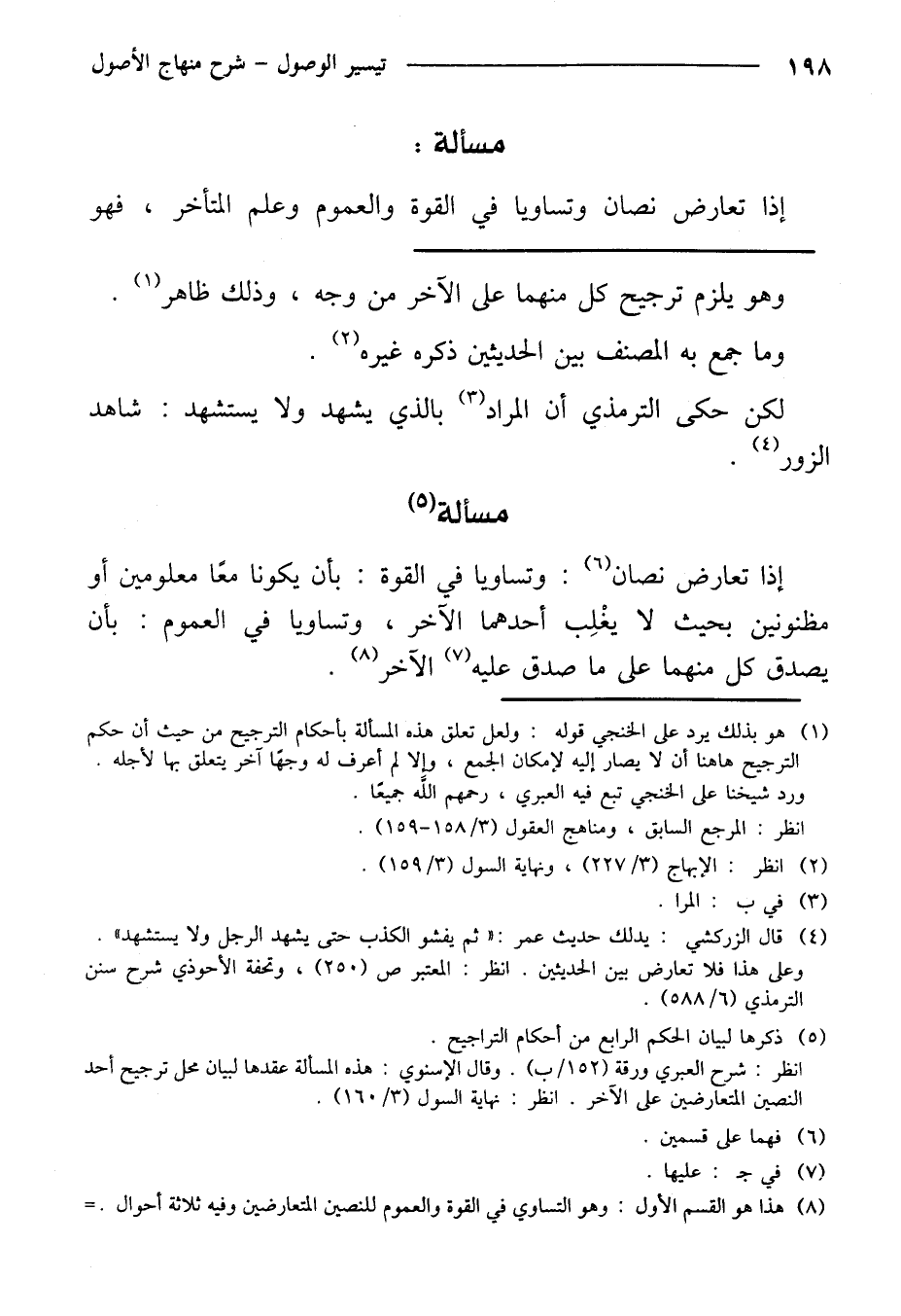 إذا تعارض نصان: وتساويا في القوة: بأن يكونا معًا معلومين أو مظنونين بحيث لا يغلب أحدهما الآخر، وتساويا في العموم: بأن يصدق كل منهما على ما صدق عليه الآخر.