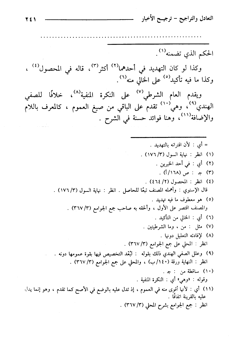 ويقدم العام الشرطي على النكرة المنفية، خلافًا للصفي الهندي، وهي تقدم على الباقي من صيغ العموم، كالمعرف باللام والإضافة، وهنا فوائد حسنة في الشرح.