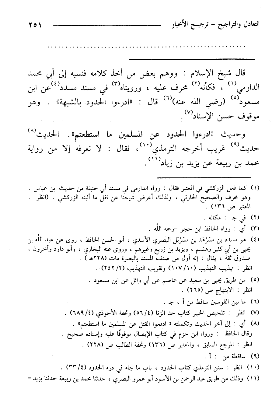 قال شيخ الإسلام: ووهم بعض من أخذ كلامه فنسيه إلى أبي محمد الدرامي، فكأنه محرف عليه، ورويناه في مسند مسدد عن ابن مسعود (رضي الله عنه) قال: «ادرءوا الحدود بالشبهة». وهو موقوف حسن الإسناد.