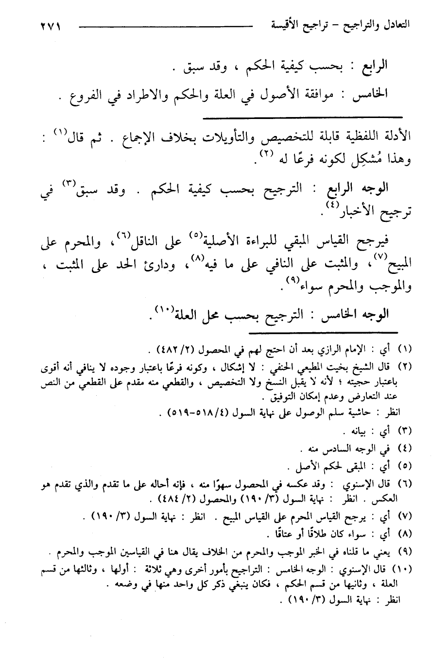 فيرجح القياس المبقي للبراءة الأصلية على الناقل، والمحرم على المبيح، والمثبت على النافي على ما فيه، ودارئ الحد على المثبت، والموجب والمحرم سواء.
