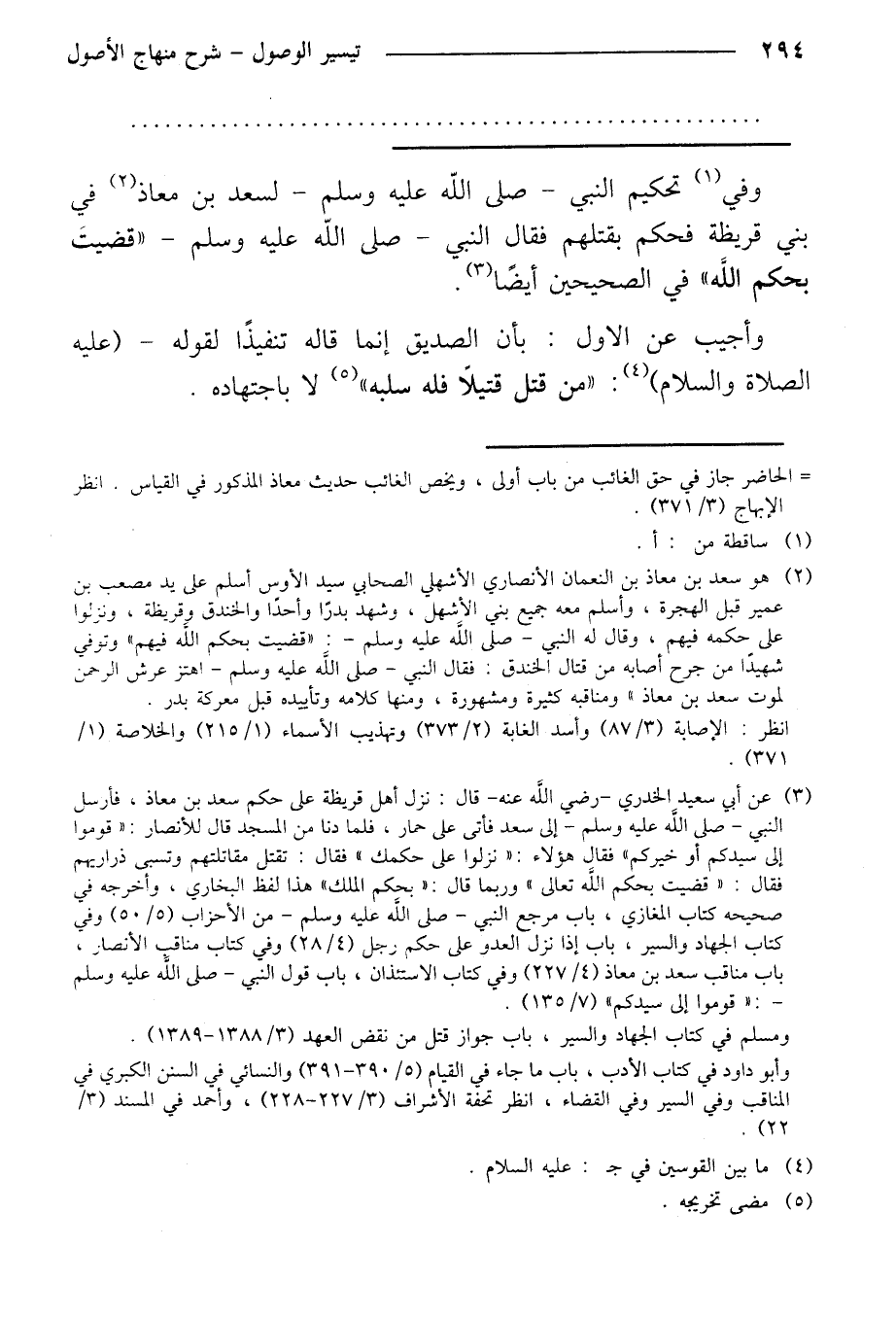 وفي تحكيم النبي -صلى الله عليه وسلم- لسعد بن معاذ في بني قريظة فحكم بقتلهم فقال النبي -صلى الله عليه وسلم- "قضيت بحكم الله" في الصحيحين أيضًا.