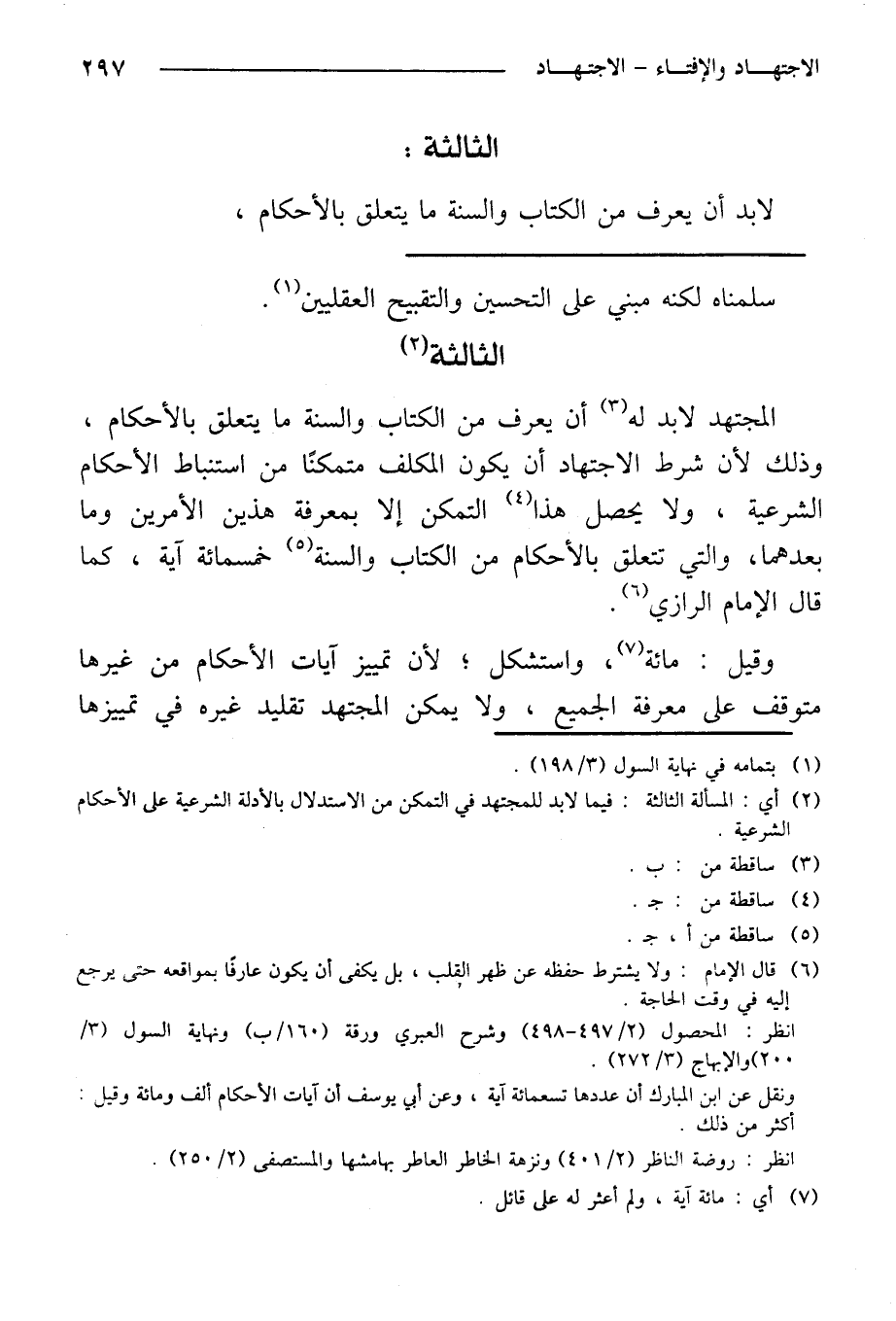 المجتهد لا بد له أن يعرف من الكتاب والسنة ما يتعلق بالأحكام، وذلك لأن شرط الاجتهاد أن يكون المكلف متمكنًا من استنباط الأحكام الشرعية، ولا يحصل هذا التمكن إلا بمعرفة هذين الأمرين وما بعدهما، والتي تتعلق بالأحكام من الكتاب والسنة خمسمائة آية، كما قال الإمام الرازي.