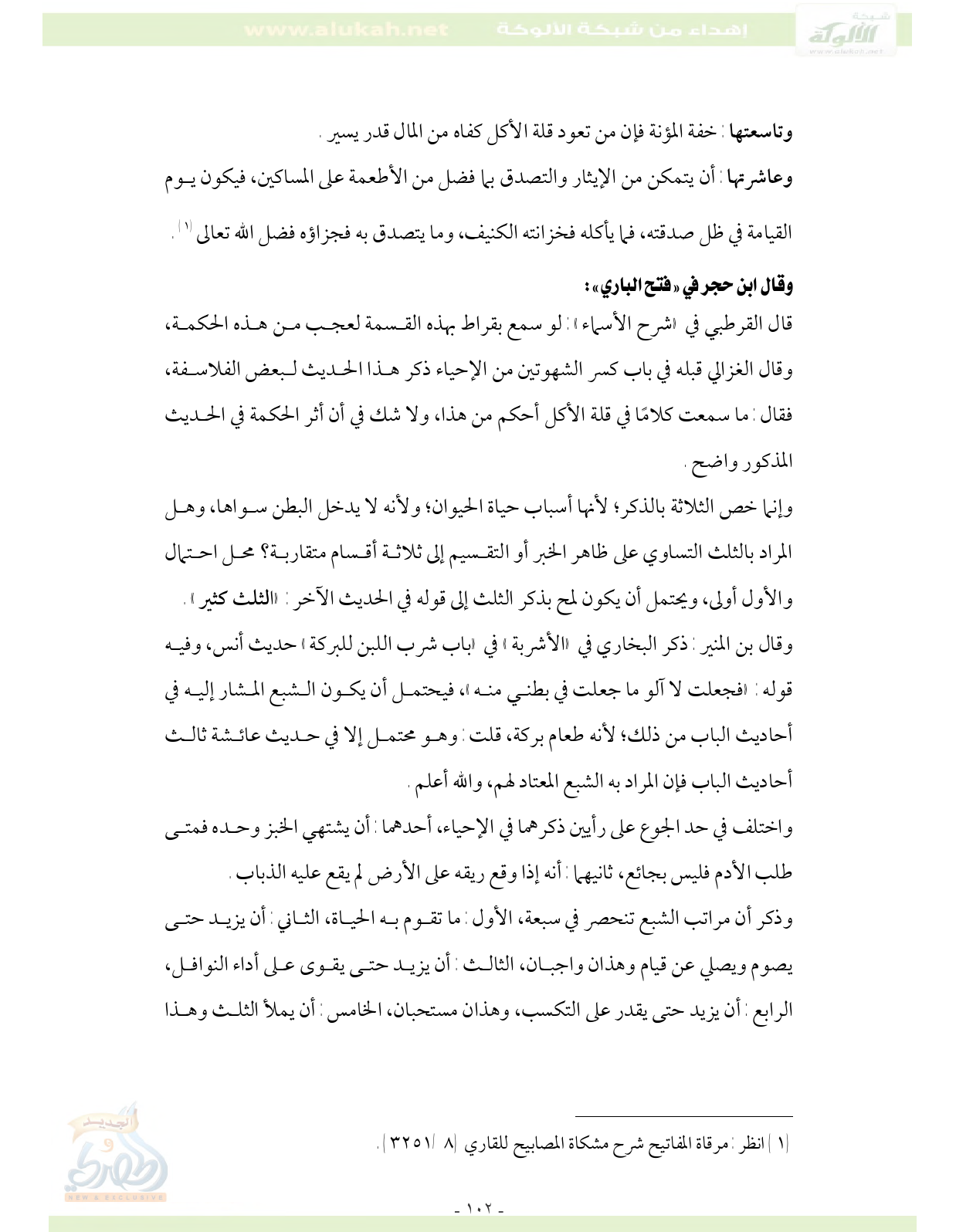 وذكر أن مراتب الشبع تنحصر في سبعة، الأول: ما تقوم به الحياة، الثاني: أن يزيد حتى يصوم ويصلي عن قيام وهذان واجبان، الثالث: أن يزيد حتى يقوى على أداء النوافل، الرابع: أن يزيد حتى يقدر على التكسب، وهذان مستحبان، الخامس: أن يملأ الثلث وهذا