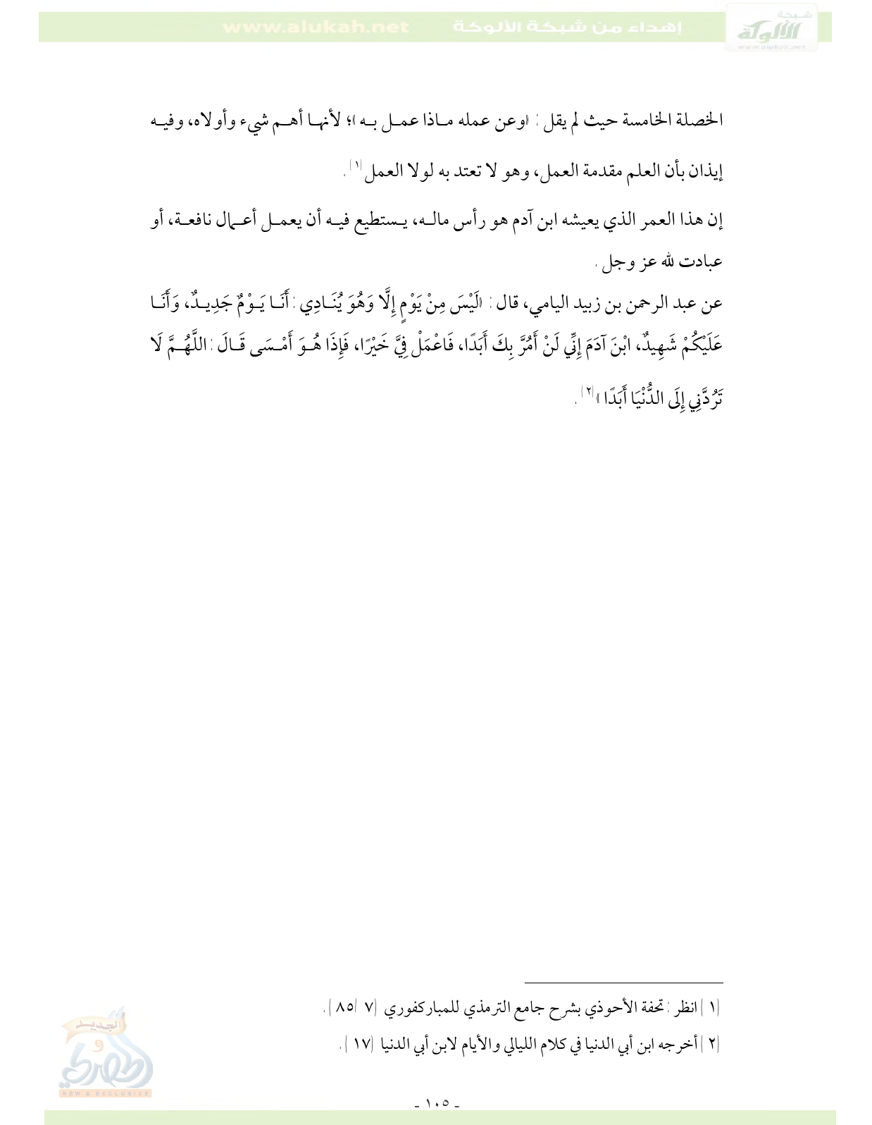 عن عبد الرحمن بن زبيد اليامي، قال: «لَيْسَ مِنْ يَوْمٍ إِلَّا وَهُوَ يُنَادِي: أَنَا يَوْمٌ جَدِيدٌ، وَأَنَا عَلَيْكُمْ شَهِيدٌ، ابْنَ آدَمَ إِنِّي لَنْ أَمُرَّ بِكَ أَبَدًا، فَاعْمَلْ فِيَّ خَيْرًا، فَإِذَا هُوَ أَمْسَى قَالَ: اللَّهُمَّ لَا تَرُدَّنِي إِلَى الدُّنْيَا أَبَدًا» (¬2).