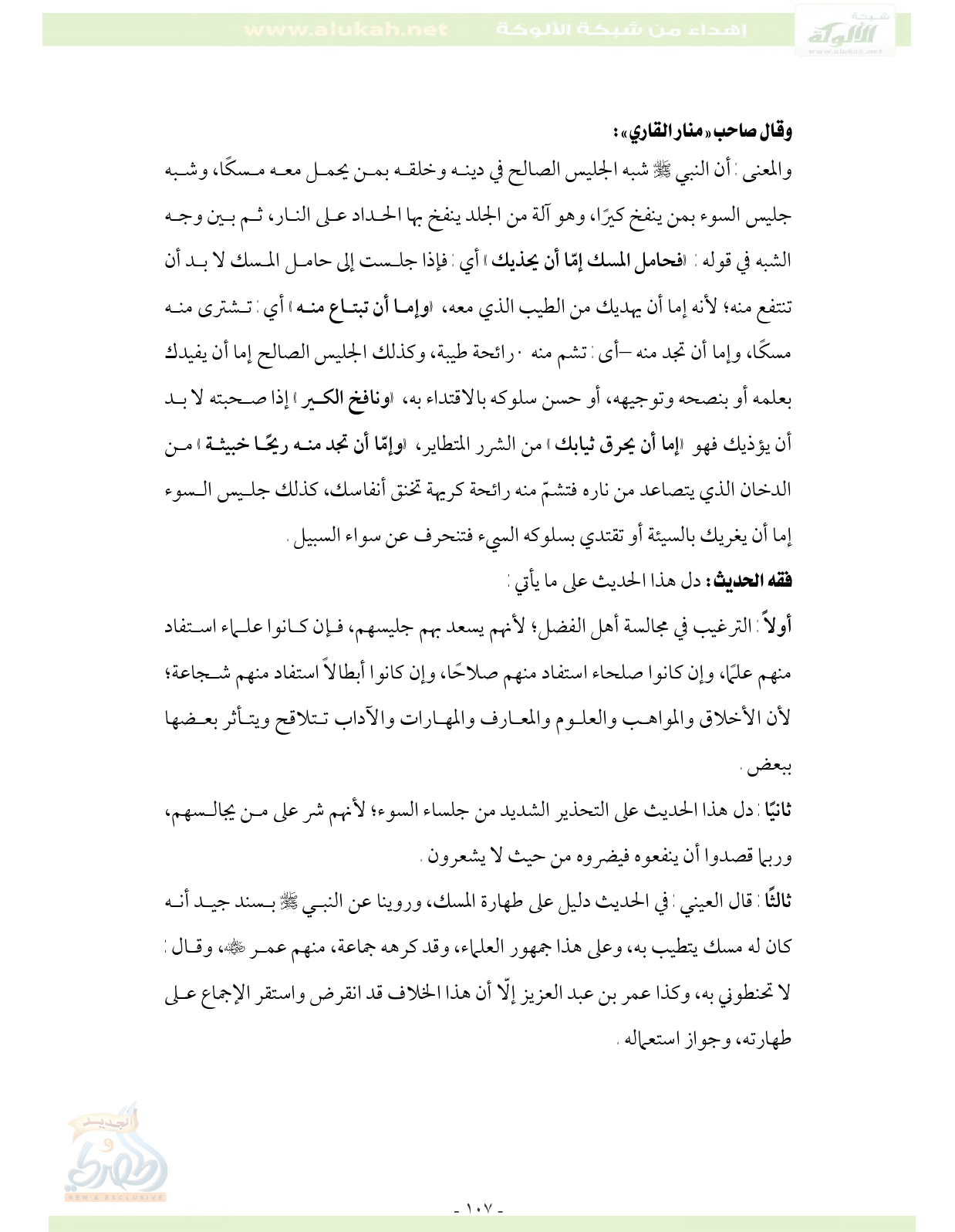 والمعنى: أن النبي - صلى الله عليه وسلم - شبه الجليس الصالح في دينه وخلقه بمن يحمل معه مسكًا، وشبه جليس السوء بمن ينفخ كيرًا، وهو آلة من الجلد ينفخ بها الحداد على النار، ثم بين وجه الشبه في قوله: «فحامل المسك إمّا أن يحذيك» أي: فإذا جلست إلى حامل المسك لا بد أن تنتفع منه؛ لأنه إما أن يهديك من الطيب الذي معه، «وإما أن تبتاع منه» أي: تشترى منه مسكًا، وإما أن تجد منه -أى: تشم منه- رائحة طيبة، وكذلك الجليس الصالح إما أن يفيدك بعلمه أو بنصحه وتوجيهه، أو حسن سلوكه بالاقتداء به، «ونافخ الكير» إذا صحبته لا بد أن يؤذيك فهو «إما أن يحرق ثيابك» من الشرر المتطاير، «وإمّا أن تجد منه ريحًا خبيثة» من الدخان الذي يتصاعد من ناره فتشمّ منه رائحة كريهة تخنق أنفاسك، كذلك جليس السوء إما أن يغريك بالسيئة أو تقتدي بسلوكه السيء فتنحرف عن سواء السبيل.