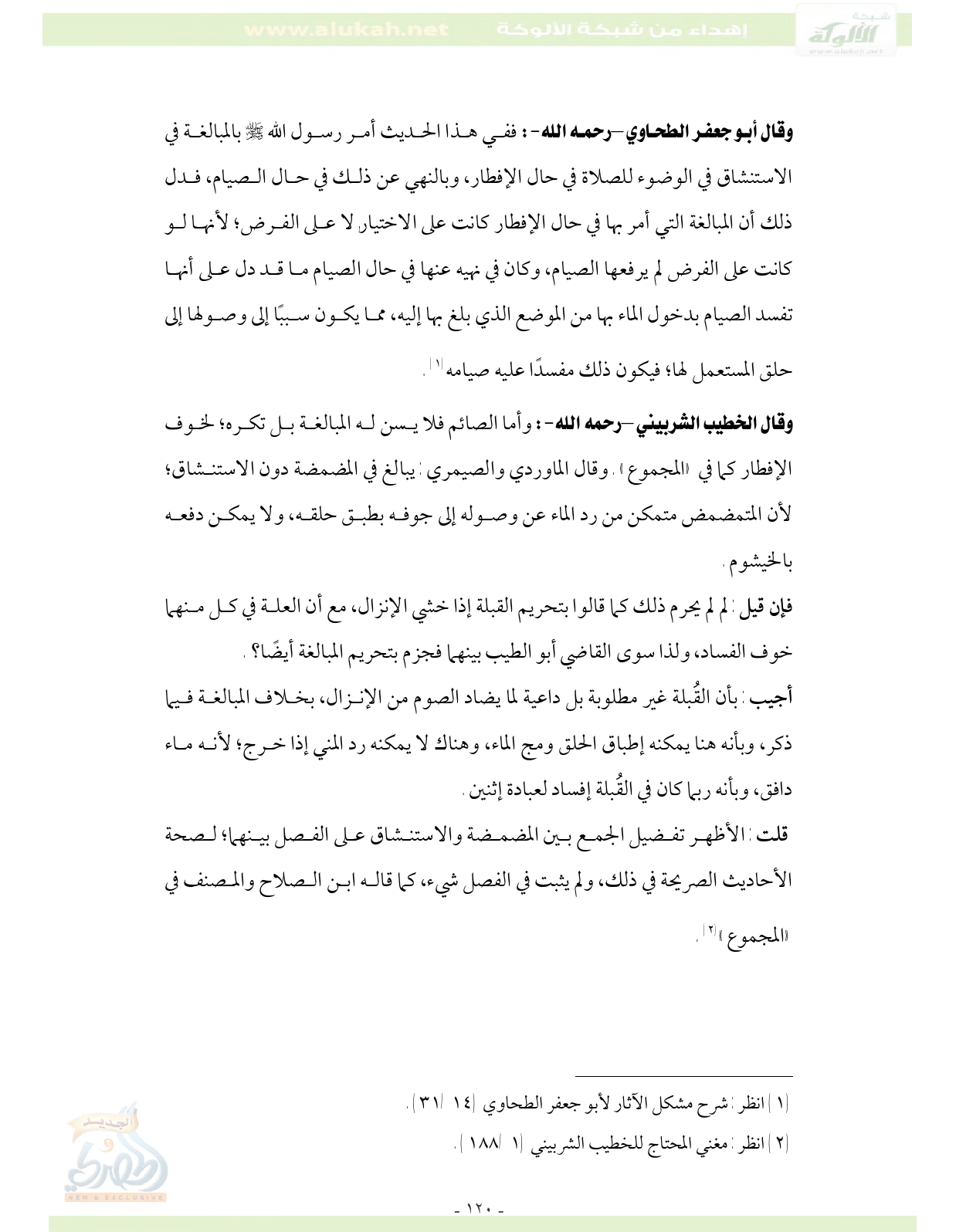 وقال أبو جعفر الطحاوي -رحمه الله-: ففي هذا الحديث أمر رسول الله - صلى الله عليه وسلم - بالمبالغة في الاستنشاق في الوضوء للصلاة في حال الإفطار، وبالنهي عن ذلك في حال الصيام، فدل ذلك أن المبالغة التي أمر بها في حال الإفطار كانت على الاختيار, لا على الفرض؛ لأنها لو كانت على الفرض لم يرفعها الصيام، وكان في نهيه عنها في حال الصيام ما قد دل على أنها تفسد الصيام بدخول الماء بها من الموضع الذي بلغ بها إليه، مما يكون سببًا إلى وصولها إلى حلق المستعمل لها؛ فيكون ذلك مفسدًا عليه صيامه (¬1).