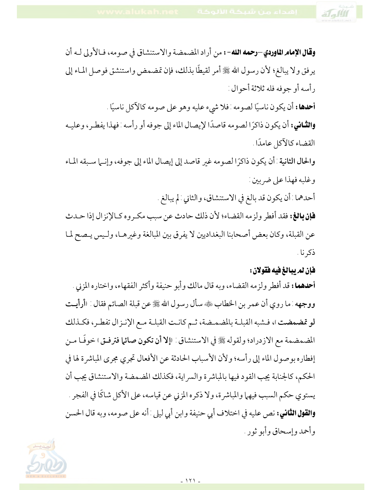 وقال الإمام الماوردي -رحمه الله-: من أراد المضمضة والاستنشاق في صومه، فالأولى له أن يرفق ولا يبالغ؛ لأن رسول الله - صلى الله عليه وسلم - أمر لقيطًا بذلك، فإن تمضمض واستنشق فوصل الماء إلى رأسه أو جوفه فله ثلاثة أحوال: