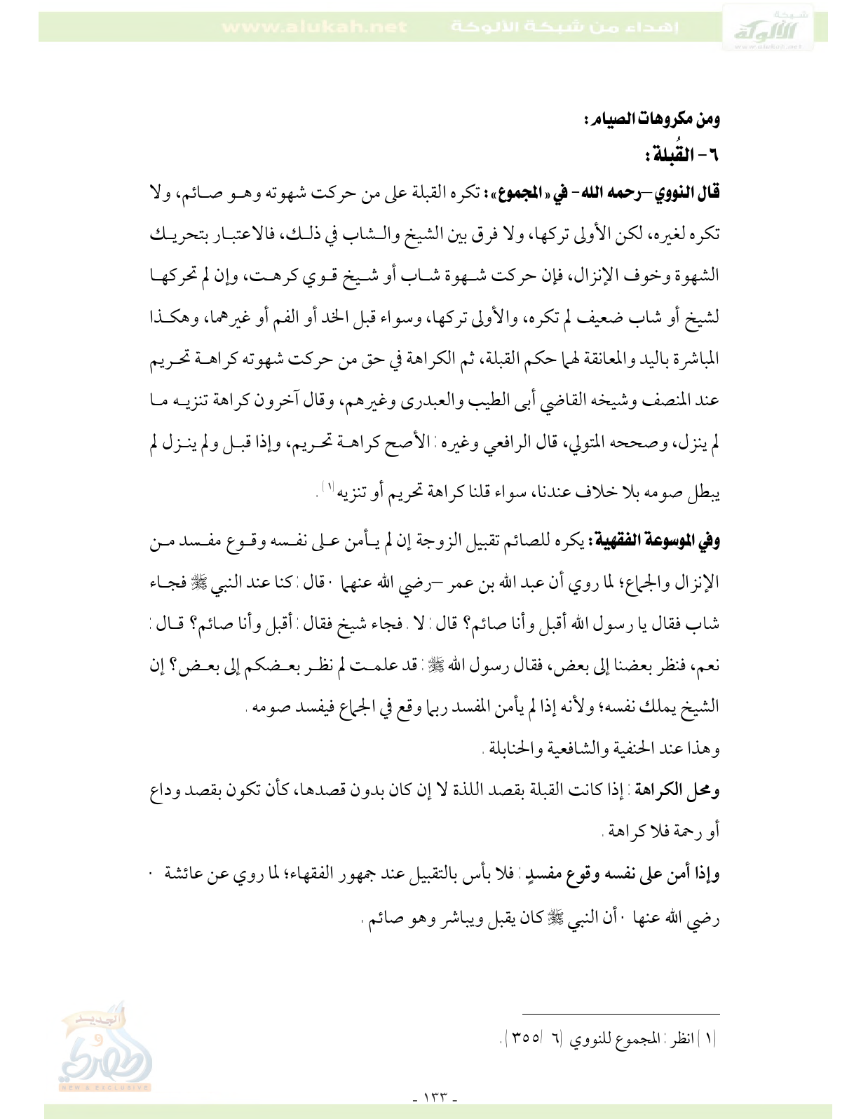 قال النووي -رحمه الله- في «المجموع»: تكره القبلة على من حركت شهوته وهو صائم، ولا تكره لغيره، لكن الأولى تركها، ولا فرق بين الشيخ والشاب في ذلك، فالاعتبار بتحريك الشهوة وخوف الإنزال، فإن حركت شهوة شاب أو شيخ قوي كرهت، وإن لم تحركها لشيخ أو شاب ضعيف لم تكره، والأولى تركها، وسواء قبل الخد أو الفم أو غيرهما، وهكذا المباشرة باليد والمعانقة لهما حكم القبلة، ثم الكراهة في حق من حركت شهوته كراهة تحريم عند المنصف وشيخه القاضي أبى الطيب والعبدرى وغيرهم، وقال آخرون كراهة تنزيه ما لم ينزل، وصححه المتولي، قال الرافعي وغيره: الأصح كراهة تحريم، وإذا قبل ولم ينزل لم يبطل صومه بلا خلاف عندنا، سواء قلنا كراهة تحريم أو تنزيه (¬1).
