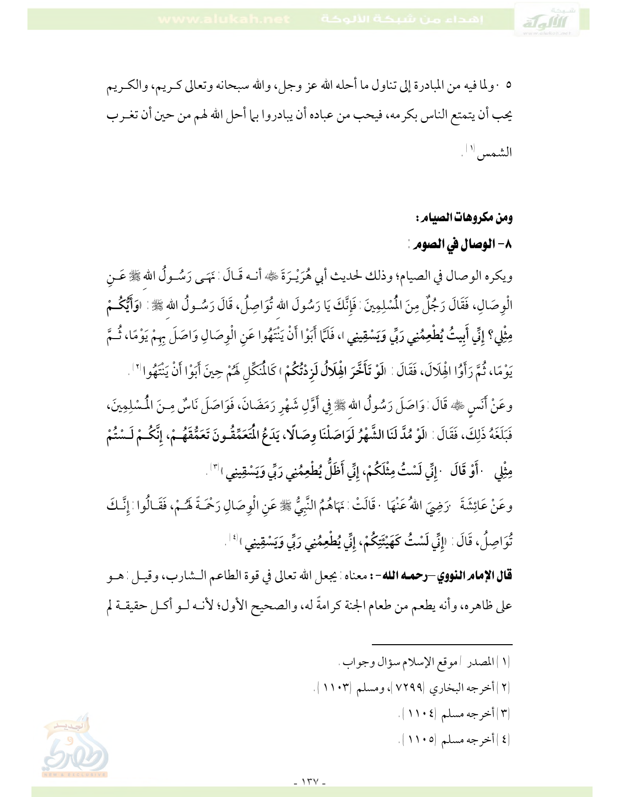 ويكره الوصال في الصيام؛ وذلك لحديث أبي هُرَيْرَةَ - رضي الله عنه - أنه قَالَ: نَهَى رَسُولُ اللهِ - صلى الله عليه وسلم - عَنِ الْوِصَالِ، فَقَالَ رَجُلٌ مِنَ الْمُسْلِمِينَ: فَإِنَّكَ يَا رَسُولَ اللهِ تُوَاصِلُ، قَالَ رَسُولُ اللهِ - صلى الله عليه وسلم -: «وَأَيُّكُمْ مِثْلِي؟ إِنِّي أَبِيتُ يُطْعِمُنِي رَبِّي وَيَسْقِينِي»، فَلَمَّا أَبَوْا أَنْ يَنْتَهُوا عَنِ الْوِصَالِ وَاصَلَ بِهِمْ يَوْمًا، ثُمَّ يَوْمًا، ثُمَّ رَأَوُا الْهِلَالَ، فَقَالَ: «لَوْ تَأَخَّرَ الْهِلَالُ لَزِدْتُكُمْ» كَالْمُنَكِّلِ لَهُمْ حِينَ أَبَوْا أَنْ يَنْتَهُوا (¬2).