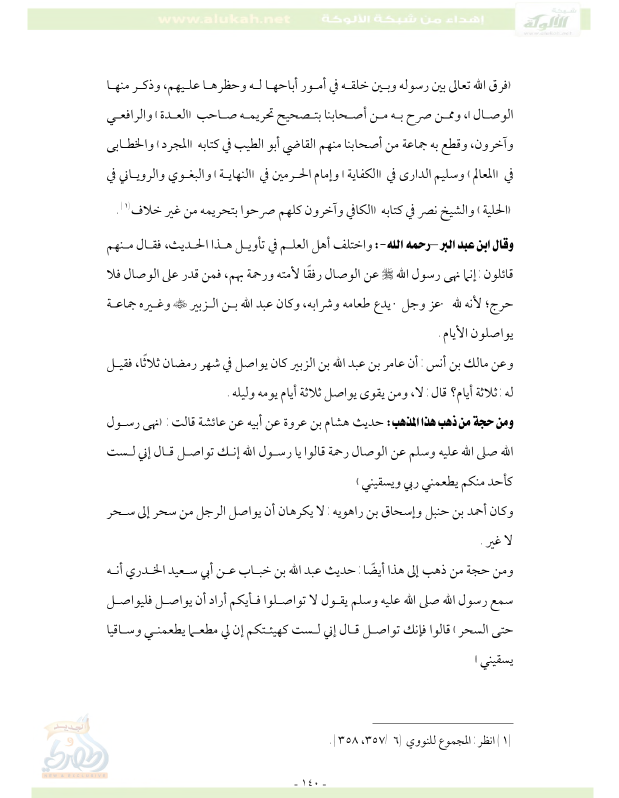ومن حجة من ذهب هذا المذهب: حديث هشام بن عروة عن أبيه عن عائشة قالت: «نهى رسول الله صلى الله عليه وسلم عن الوصال رحمة قالوا يا رسول الله إنك تواصل قال إني لست كأحد منكم يطعمني ربي ويسقيني»