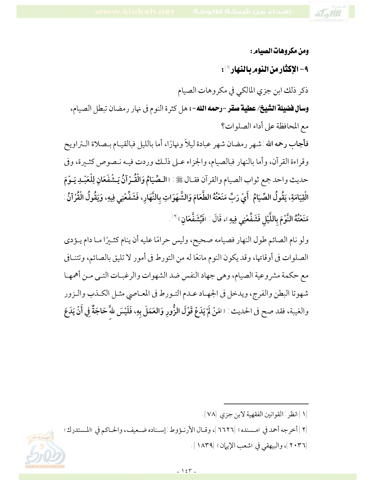 وسأل فضيلة الشيخ/ عطية صقر -رحمه الله-: هل كثرة النوم فى نهار رمضان تبطل الصيام، مع المحافظة على أداء الصلوات؟