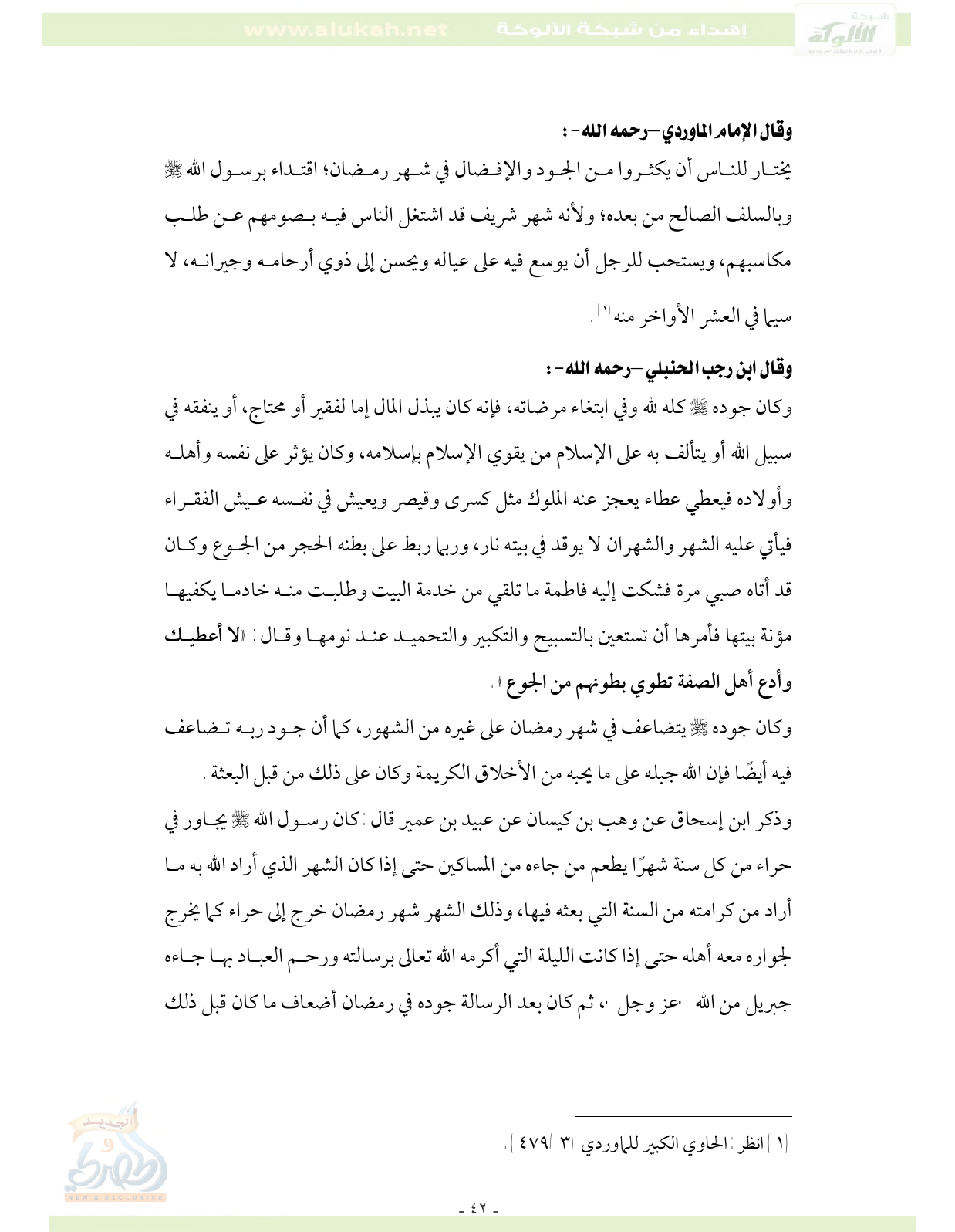 وكان جوده - صلى الله عليه وسلم - يتضاعف في شهر رمضان على غيره من الشهور، كما أن جود ربه تضاعف فيه أيضًا فإن الله جبله على ما يحبه من الأخلاق الكريمة وكان على ذلك من قبل البعثة.