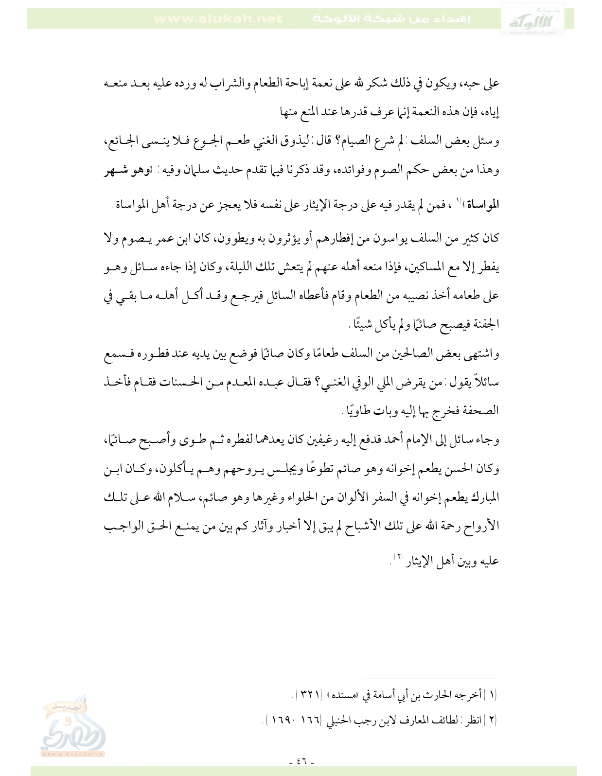 وجاء سائل إلى الإمام أحمد فدفع إليه رغيفين كان يعدهما لفطره ثم طوى وأصبح صائمًا، وكان الحسن يطعم إخوانه وهو صائم تطوعًا ويجلس يروحهم وهم يأكلون، وكان ابن المبارك يطعم إخوانه في السفر الألوان من الحلواء وغيرها وهو صائم، سلام الله على تلك الأرواح رحمة الله على تلك الأشباح لم يبق إلا أخبار وآثار كم بين من يمنع الحق الواجب عليه وبين أهل الإيثار (¬2).