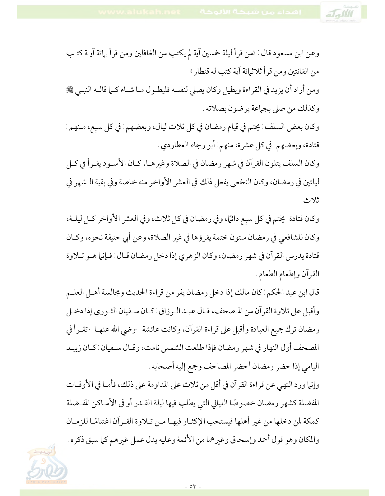 وكان السلف يتلون القرآن في شهر رمضان في الصلاة وغيرها، كان الأسود يقرأ في كل ليلتين في رمضان، وكان النخعي يفعل ذلك في العشر الأواخر منه خاصة وفي بقية الشهر في ثلاث.