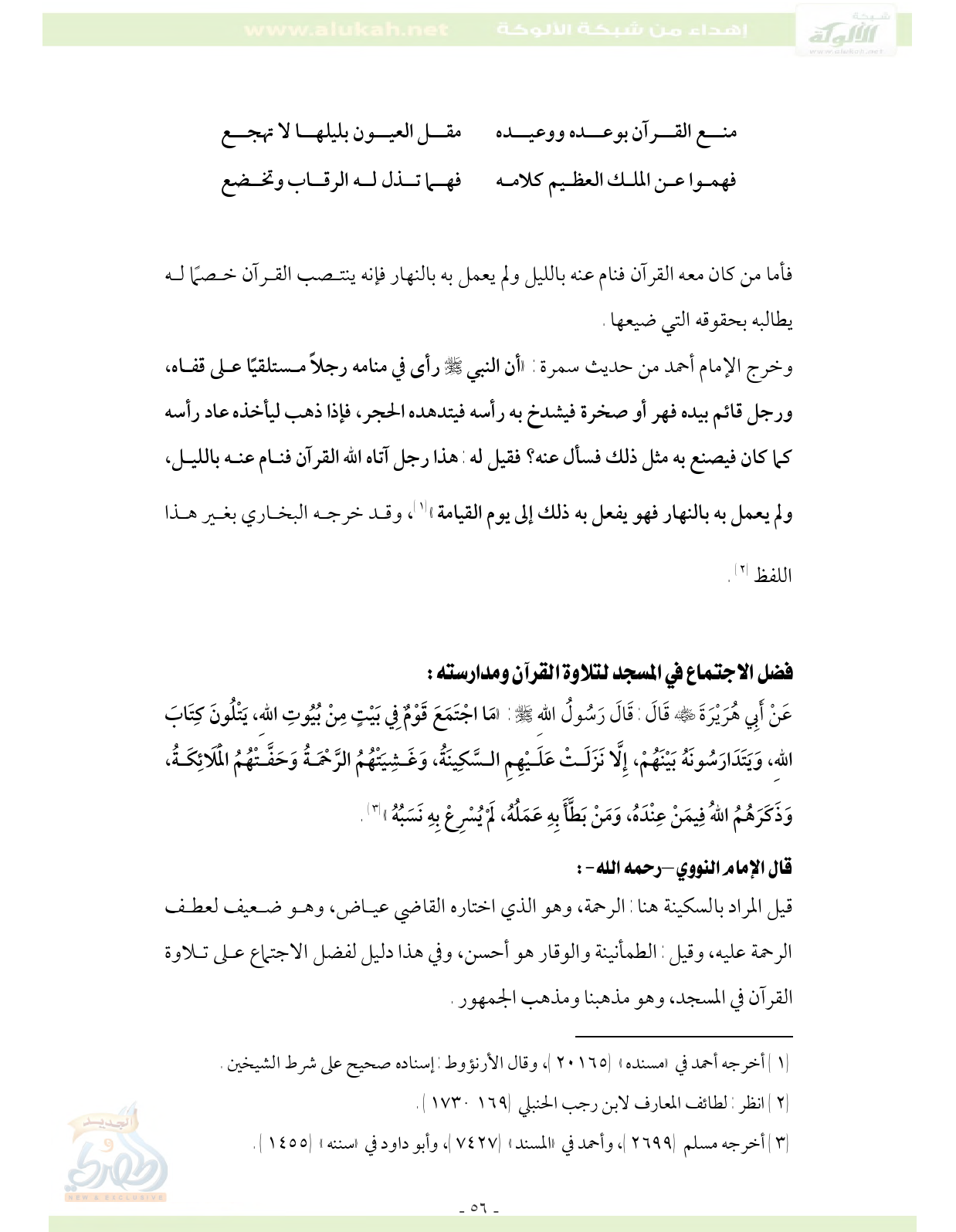 عَنْ أَبِي هُرَيْرَةَ - رضي الله عنه - قَالَ: قَالَ رَسُولُ اللهِ - صلى الله عليه وسلم -: «مَا اجْتَمَعَ قَوْمٌ فِي بَيْتٍ مِنْ بُيُوتِ اللهِ، يَتْلُونَ كِتَابَ اللهِ، وَيَتَدَارَسُونَهُ بَيْنَهُمْ، إِلَّا نَزَلَتْ عَلَيْهِمِ السَّكِينَةُ، وَغَشِيَتْهُمُ الرَّحْمَةُ وَحَفَّتْهُمُ الْمَلَائِكَةُ، وَذَكَرَهُمُ اللهُ فِيمَنْ عِنْدَهُ، وَمَنْ بَطَّأَ بِهِ عَمَلُهُ، لَمْ يُسْرِعْ بِهِ نَسَبُهُ» (¬3).