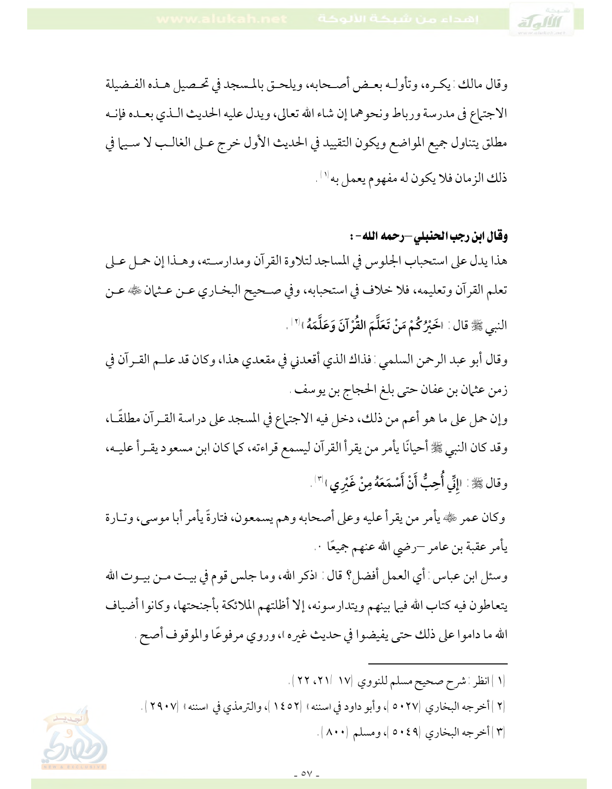 وإن حمل على ما هو أعم من ذلك، دخل فيه الاجتماع في المسجد على دراسة القرآن مطلقًا، وقد كان النبي - صلى الله عليه وسلم - أحيانًا يأمر من يقرأ القرآن ليسمع قراءته، كما كان ابن مسعود يقرأ عليه، وقال - صلى الله عليه وسلم -: «إِنِّي أُحِبُّ أَنْ أَسْمَعَهُ مِنْ غَيْرِي» (¬3).