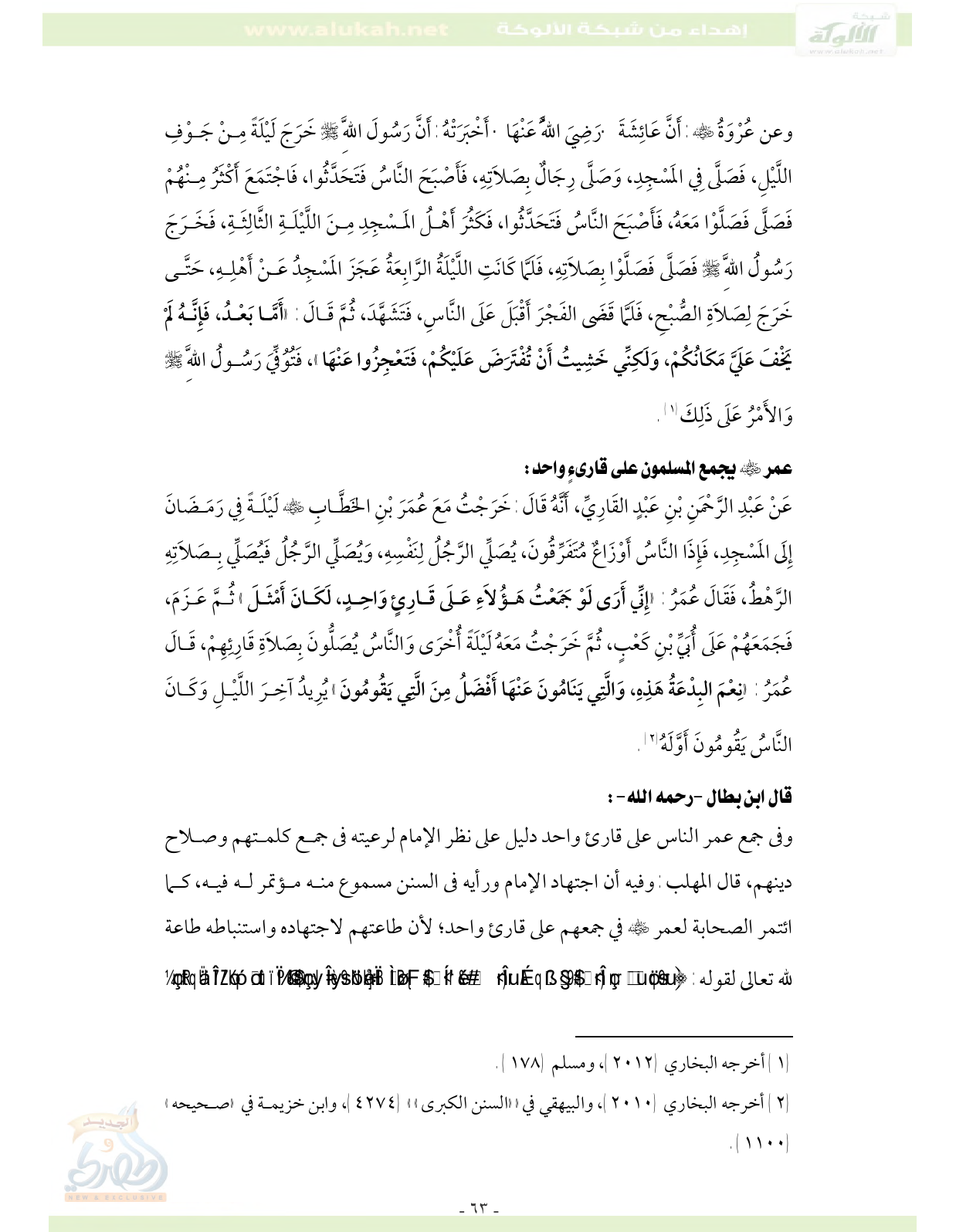 عَنْ عَبْدِ الرَّحْمَنِ بْنِ عَبْدٍ القَارِيِّ، أَنَّهُ قَالَ: خَرَجْتُ مَعَ عُمَرَ بْنِ الخَطَّابِ - رضي الله عنه - لَيْلَةً فِي رَمَضَانَ إِلَى المَسْجِدِ، فَإِذَا النَّاسُ أَوْزَاعٌ مُتَفَرِّقُونَ، يُصَلِّي الرَّجُلُ لِنَفْسِهِ، وَيُصَلِّي الرَّجُلُ فَيُصَلِّي بِصَلاَتِهِ الرَّهْطُ، فَقَالَ عُمَرُ: «إِنِّي أَرَى لَوْ جَمَعْتُ هَؤُلاَءِ عَلَى قَارِئٍ وَاحِدٍ، لَكَانَ أَمْثَلَ» ثُمَّ عَزَمَ، فَجَمَعَهُمْ عَلَى أُبَيِّ بْنِ كَعْبٍ، ثُمَّ خَرَجْتُ مَعَهُ لَيْلَةً أُخْرَى وَالنَّاسُ يُصَلُّونَ بِصَلاَةِ قَارِئِهِمْ، قَالَ عُمَرُ: «نِعْمَ البِدْعَةُ هَذِهِ، وَالَّتِي يَنَامُونَ عَنْهَا أَفْضَلُ مِنَ الَّتِي يَقُومُونَ» يُرِيدُ آخِرَ اللَّيْلِ وَكَانَ النَّاسُ يَقُومُونَ أَوَّلَهُ (¬2).
