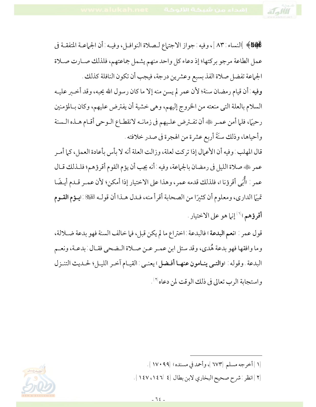 قول عمر: «نعم البدعة» فالبدعة: اختراع ما لم يكن قبل، فما خالف السنة فهو بدعة ضلالة، وما وافقها فهو بدعة هُدى، وقد سئل ابن عمر عن صلاة الضحى فقال: بدعة، ونعم البدعة. وقوله: «والتى ينامون عنها أفضل» يعنى: القيام آخر الليل؛ لحديث التنزل واستجابة الرب تعالى فى ذلك الوقت لمن دعاه (¬2).