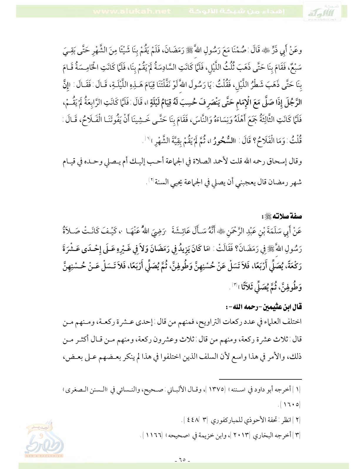 عَنْ أَبِي سَلَمَةَ بْنِ عَبْدِ الرَّحْمَنِ - رضي الله عنه - أَنَّهُ سَأَلَ عَائِشَةَ -رَضِيَ اللَّهُ عَنْهَا-، كَيْفَ كَانَتْ صَلاَةُ رَسُولِ اللَّهِ - صلى الله عليه وسلم - فِي رَمَضَانَ؟ فَقَالَتْ: «مَا كَانَ يَزِيدُ فِي رَمَضَانَ وَلاَ فِي غَيْرِهِ عَلَى إِحْدَى عَشْرَةَ رَكْعَةً، يُصَلِّي أَرْبَعًا، فَلاَ تَسَلْ عَنْ حُسْنِهِنَّ وَطُولِهِنَّ، ثُمَّ يُصَلِّي أَرْبَعًا، فَلاَ تَسَلْ عَنْ حُسْنِهِنَّ وَطُولِهِنَّ، ثُمَّ يُصَلِّي ثَلاَثًا» (¬3).