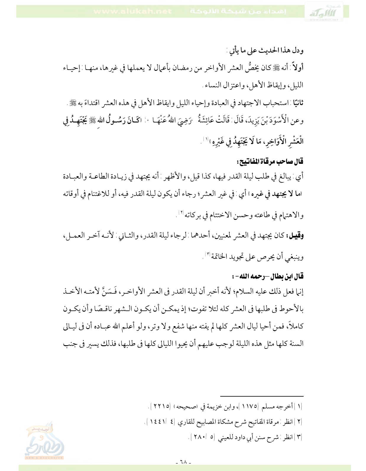 أولاً: أنه - صلى الله عليه وسلم - كان يخصُّ العشر الأواخر من رمضان بأعمال لا يعملها في غيرها، منها: إحياء الليل، وإيقاظ الأهل، واعتزال النساء.
