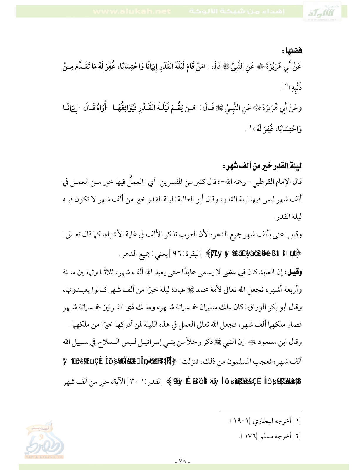 وقال ابن مسعود - رضي الله عنه -: إن النبي - صلى الله عليه وسلم - ذكر رجلاً من بني إسرائيل لبس السلاح في سبيل الله ألف شهر، فعجب المسلمون من ذلك، فنزلت: {((((((أَنْزَلْنَاهُ فِي لَيْلَةِ الْقَدْرِ (1) وَمَا أَدْرَاكَ مَا لَيْلَةُ الْقَدْرِ (2) لَيْلَةُ الْقَدْرِ خَيْرٌ مِنْ أَلْفِ شَهْرٍ} [القدر:1 - 3] الآية، خير من ألف شهر