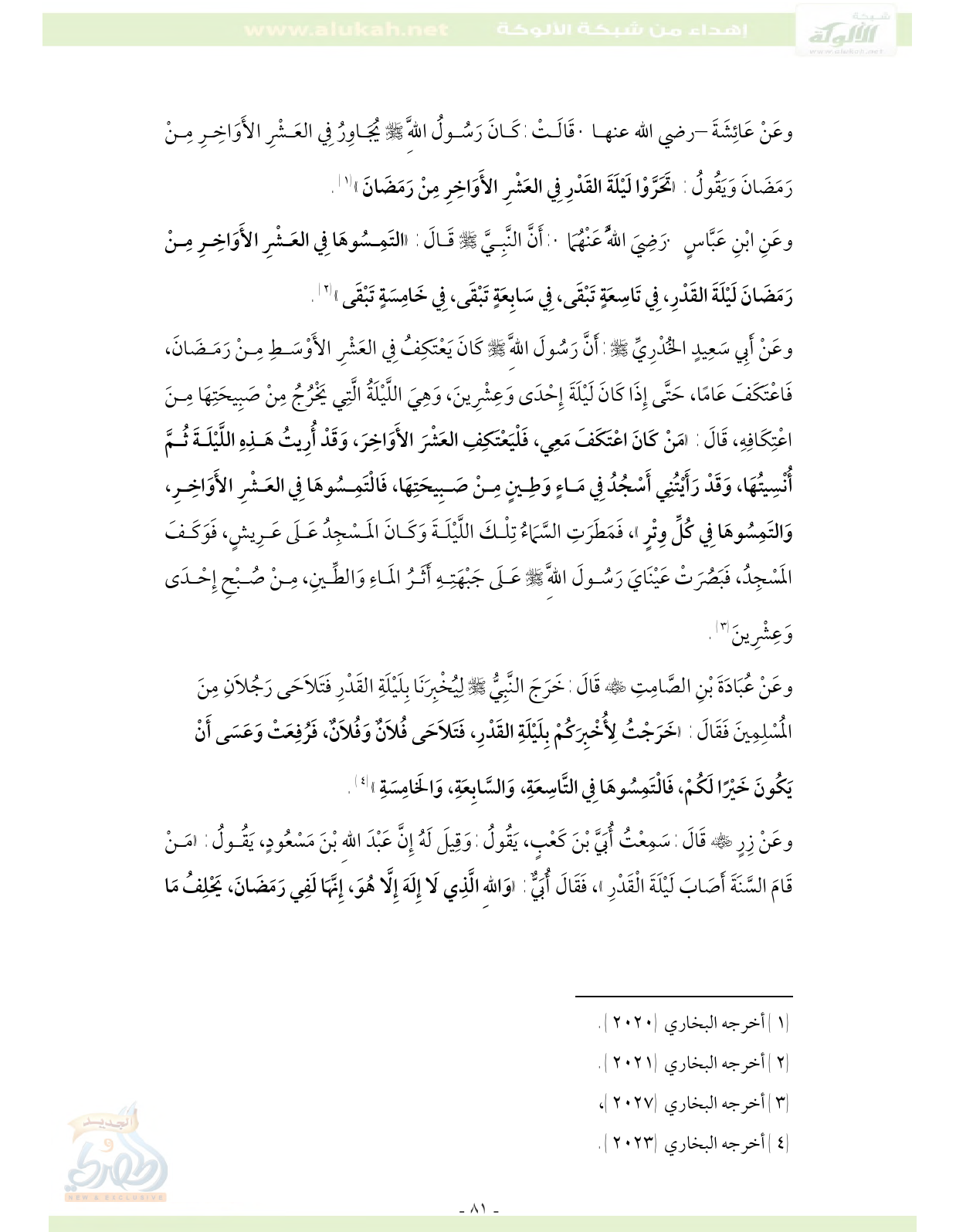 وعَنْ أَبِي سَعِيدٍ الخُدْرِيِّ - صلى الله عليه وسلم -: أَنَّ رَسُولَ اللَّهِ - صلى الله عليه وسلم - كَانَ يَعْتَكِفُ فِي العَشْرِ الأَوْسَطِ مِنْ رَمَضَانَ، فَاعْتَكَفَ عَامًا، حَتَّى إِذَا كَانَ لَيْلَةَ إِحْدَى وَعِشْرِينَ، وَهِيَ اللَّيْلَةُ الَّتِي يَخْرُجُ مِنْ صَبِيحَتِهَا مِنَ اعْتِكَافِهِ، قَالَ: «مَنْ كَانَ اعْتَكَفَ مَعِي، فَلْيَعْتَكِفِ العَشْرَ الأَوَاخِرَ، وَقَدْ أُرِيتُ هَذِهِ اللَّيْلَةَ ثُمَّ أُنْسِيتُهَا، وَقَدْ رَأَيْتُنِي أَسْجُدُ فِي مَاءٍ وَطِينٍ مِنْ صَبِيحَتِهَا، فَالْتَمِسُوهَا فِي العَشْرِ الأَوَاخِرِ، وَالتَمِسُوهَا فِي كُلِّ وِتْرٍ»، فَمَطَرَتِ السَّمَاءُ تِلْكَ اللَّيْلَةَ وَكَانَ المَسْجِدُ عَلَى عَرِيشٍ، فَوَكَفَ المَسْجِدُ، فَبَصُرَتْ عَيْنَايَ رَسُولَ اللَّهِ - صلى الله عليه وسلم - عَلَى جَبْهَتِهِ أَثَرُ المَاءِ وَالطِّينِ، مِنْ صُبْحِ إِحْدَى وَعِشْرِينَ (¬3).
