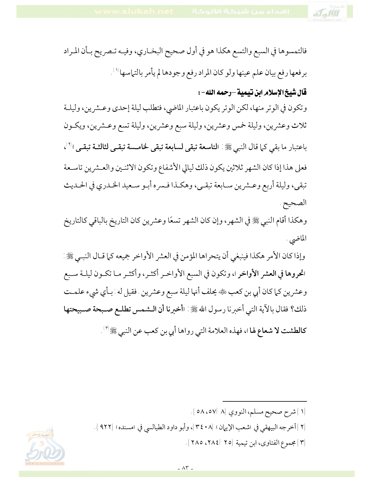 وإذا كان الأمر هكذا فينبغي أن يتحراها المؤمن في العشر الأواخر جميعه كما قال النبي - صلى الله عليه وسلم -: «تحروها في العشر الأواخر»، وتكون في السبع الأواخر أكثر، وأكثر ما تكون ليلة سبع وعشرين كما كان أبي بن كعب - رضي الله عنه - يحلف أنها ليلة سبع وعشرين. فقيل له: بأي شيء علمت ذلك؟ فقال بالآية التي أخبرنا رسول الله - صلى الله عليه وسلم -: «أخبرنا أن الشمس تطلع صبحة صبيحتها كالطشت لا شعاع لها»، فهذه العلامة التي رواها أبي بن كعب عن النبي - صلى الله عليه وسلم - (¬3).