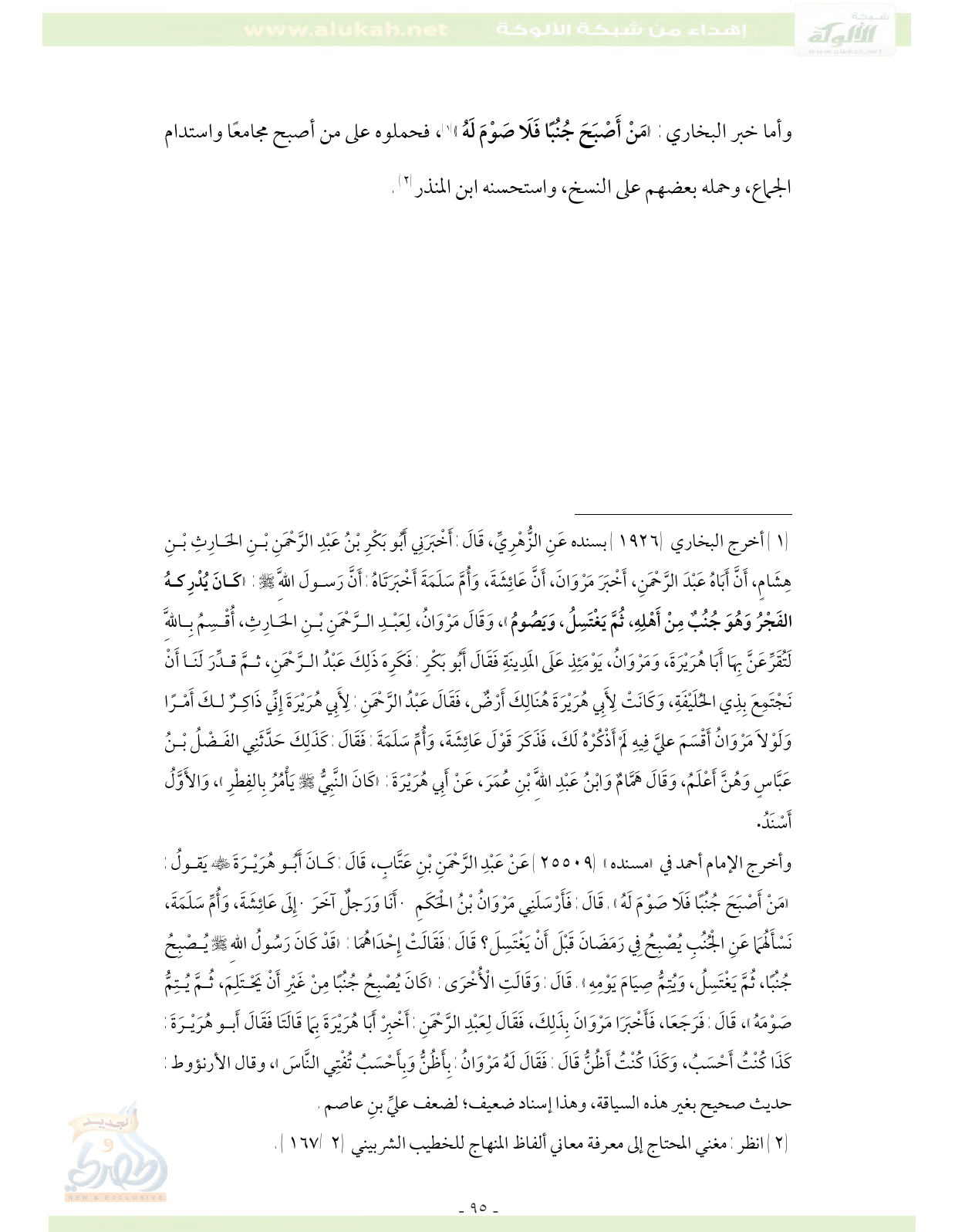 (¬1) أخرج البخاري (1926) بسنده عَنِ الزُّهْرِيِّ، قَالَ: أَخْبَرَنِي أَبُو بَكْرِ بْنُ عَبْدِ الرَّحْمَنِ بْنِ الحَارِثِ بْنِ هِشَامٍ، أَنَّ أَبَاهُ عَبْدَ الرَّحْمَنِ، أَخْبَرَ مَرْوَانَ، أَنَّ عَائِشَةَ، وَأُمَّ سَلَمَةَ أَخْبَرَتَاهُ: أَنَّ رَسولَ اللَّهِ - صلى الله عليه وسلم -: «كَانَ يُدْرِكهُ الفَجْرُ وَهُوَ جُنُبٌ مِنْ أَهْلِهِ، ثُمَّ يَغْتَسِلُ، وَيَصُومُ»، وَقَالَ مَرْوَانُ، لِعَبْدِ الرَّحْمَنِ بْنِ الحَارِثِ، أُقْسِمُ بِاللَّهِ لَتُقَرِّعَنَّ بِهَا أَبَا هُرَيْرَةَ، وَمَرْوَانُ، يَوْمَئِذٍ عَلَى المَدِينَةِ فَقَالَ أَبُو بَكْرٍ: فَكَرِهَ ذَلِكَ عَبْدُ الرَّحْمَنِ، ثمَّ قدِّرَ لَنَا أَنْ نَجْتَمِعَ بِذِي الحُلَيْفَةِ، وَكَانَتْ لِأَبِي هُرَيْرَةَ هُنَالِكَ أَرْضٌ، فَقَالَ عَبْدُ الرَّحْمَنِ: لِأَبِي هُرَيْرَةَ إِنِّي ذَاكِرٌ لكَ أَمْرًا وَلَوْلاَ مَرْوَانُ أَقْسَمَ عليَّ فِيهِ لَمْ أَذْكُرْهُ لَكَ، فَذَكَرَ قَوْلَ عَائِشَةَ، وَأُمِّ سَلَمَةَ: فَقَالَ: كَذَلِكَ حَدَّثَنِي الفَضْلُ بْنُ عَبَّاسٍ وَهُنَّ أَعْلَمُ، وَقَالَ هَمَّامٌ وَابْنُ عَبْدِ اللَّهِ بْنِ عُمَرَ، عَنْ أَبِي هُرَيْرَةَ: «كَانَ النَّبِيُّ - صلى الله عليه وسلم - يَامُرُ بِالفِطْرِ»، وَالأَوَّلُ أَسْنَدُ.