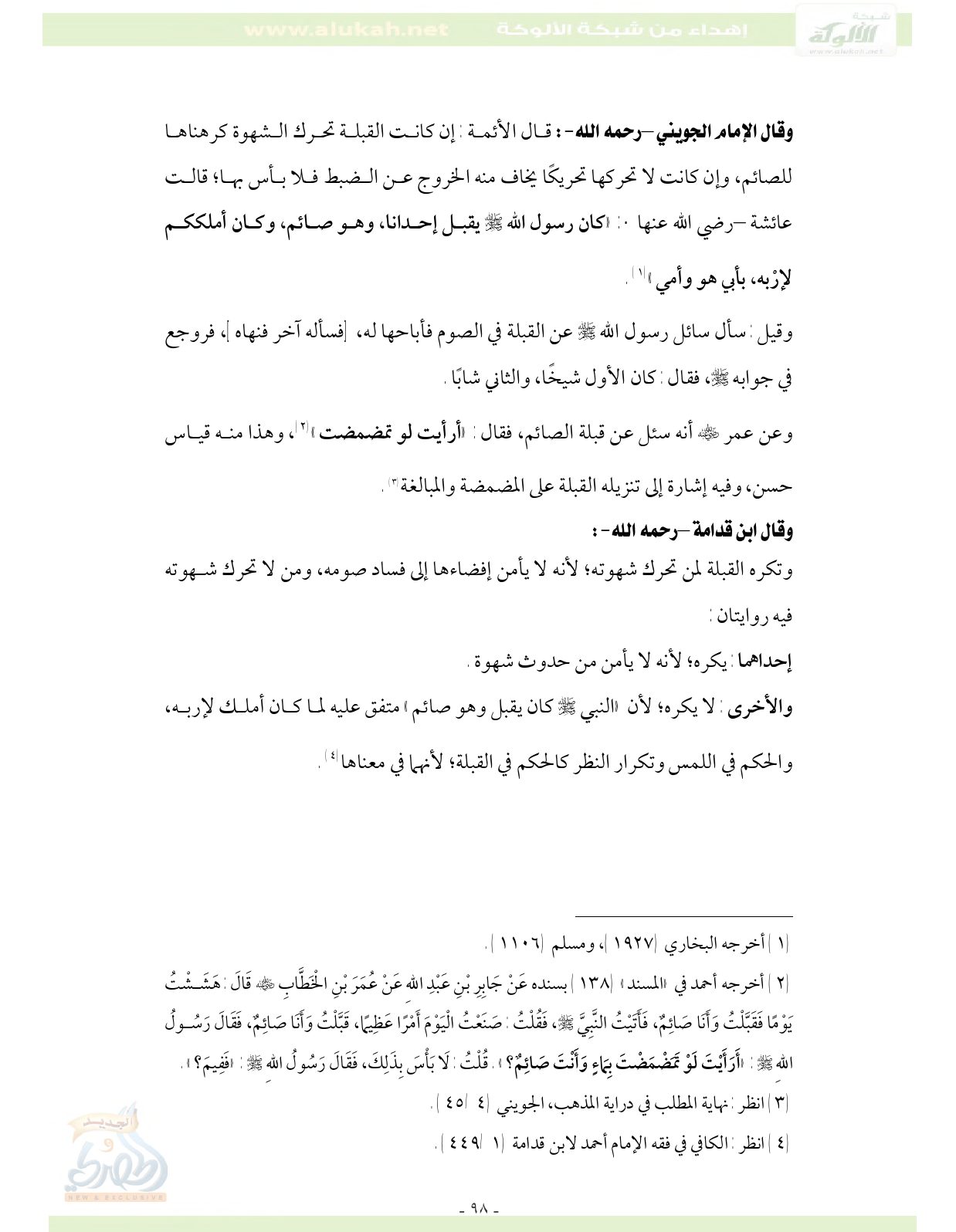 (¬2) أخرجه أحمد في «المسند» (138) بسنده عَنْ جَابِرِ بْنِ عَبْدِ اللهِ عَنْ عُمَرَ بْنِ الْخَطَّابِ - رضي الله عنه - قَالَ: هَشَشْتُ يَوْمًا فَقَبَّلْتُ وَأَنَا صَائِمٌ، فَأَتَيْتُ النَّبِيَّ - صلى الله عليه وسلم -، فَقُلْتُ: صَنَعْتُ الْيَوْمَ أَمْرًا عَظِيمًا، قَبَّلْتُ وَأَنَا صَائِمٌ، فَقَالَ رَسُولُ اللهِ - صلى الله عليه وسلم -: «أَرَأَيْتَ لَوْ تَمَضْمَضْتَ بِمَاءٍ وَأَنْتَ صَائِمٌ؟». قُلْتُ: لَا بَاسَ بِذَلِكَ، فَقَالَ رَسُولُ اللهِ - صلى الله عليه وسلم -: «فَفِيمَ؟».