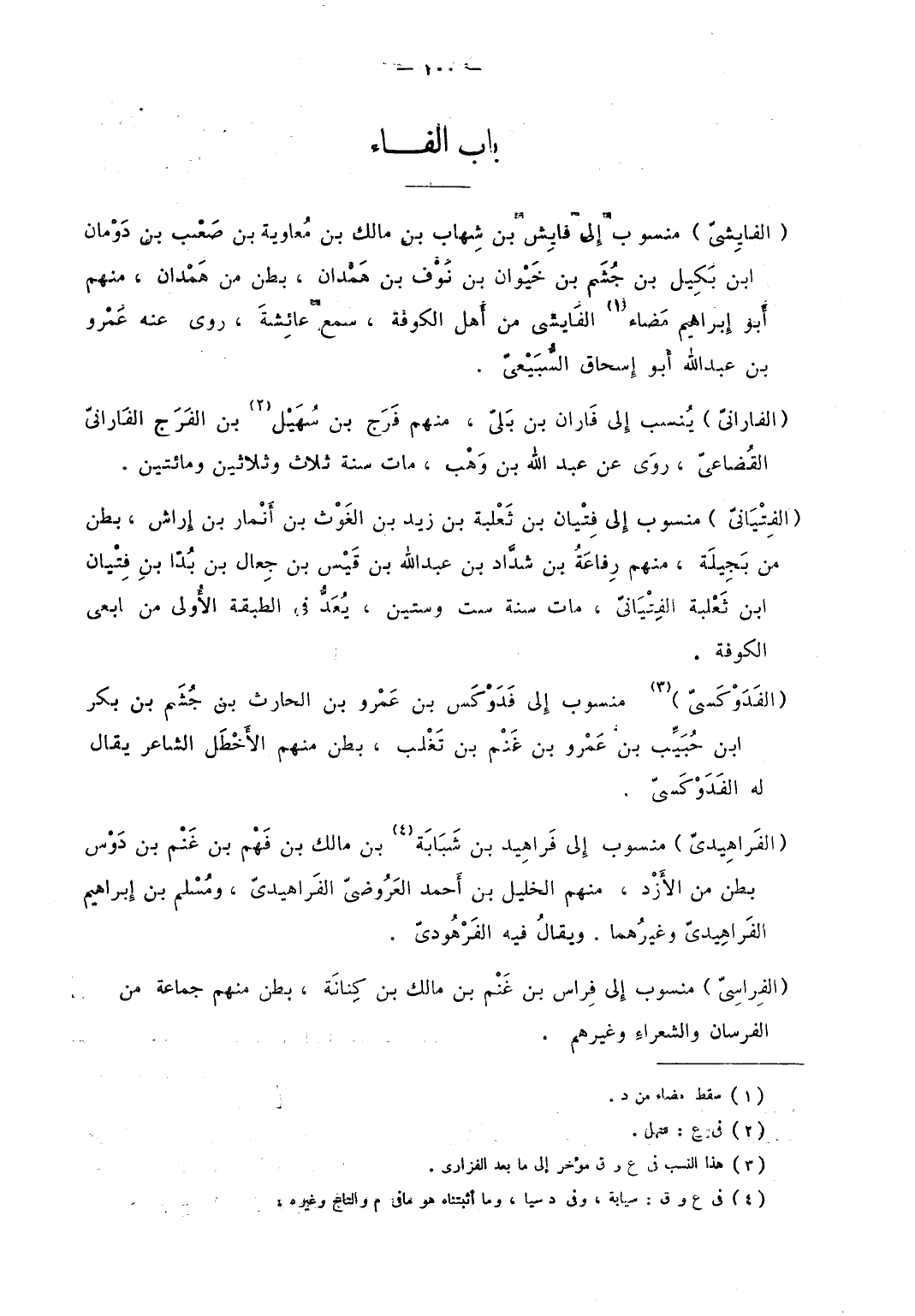 الفايِشيمنسوب إلى فايِش بن شهاب بن مالك بن معاوية بن صعب بن دُومَان بن بَكِيل بن جُشَم بن خَيْوان بن نَوْف بن هَمْدان، بطن من هَمْدان، منهم أبو إبراهيم مَضَاء الفَايشي من أهل الكوفة، سمع عائشة، روى عنه عمرو بن عبد الله أبو إسحاق السُّبَيْعي.