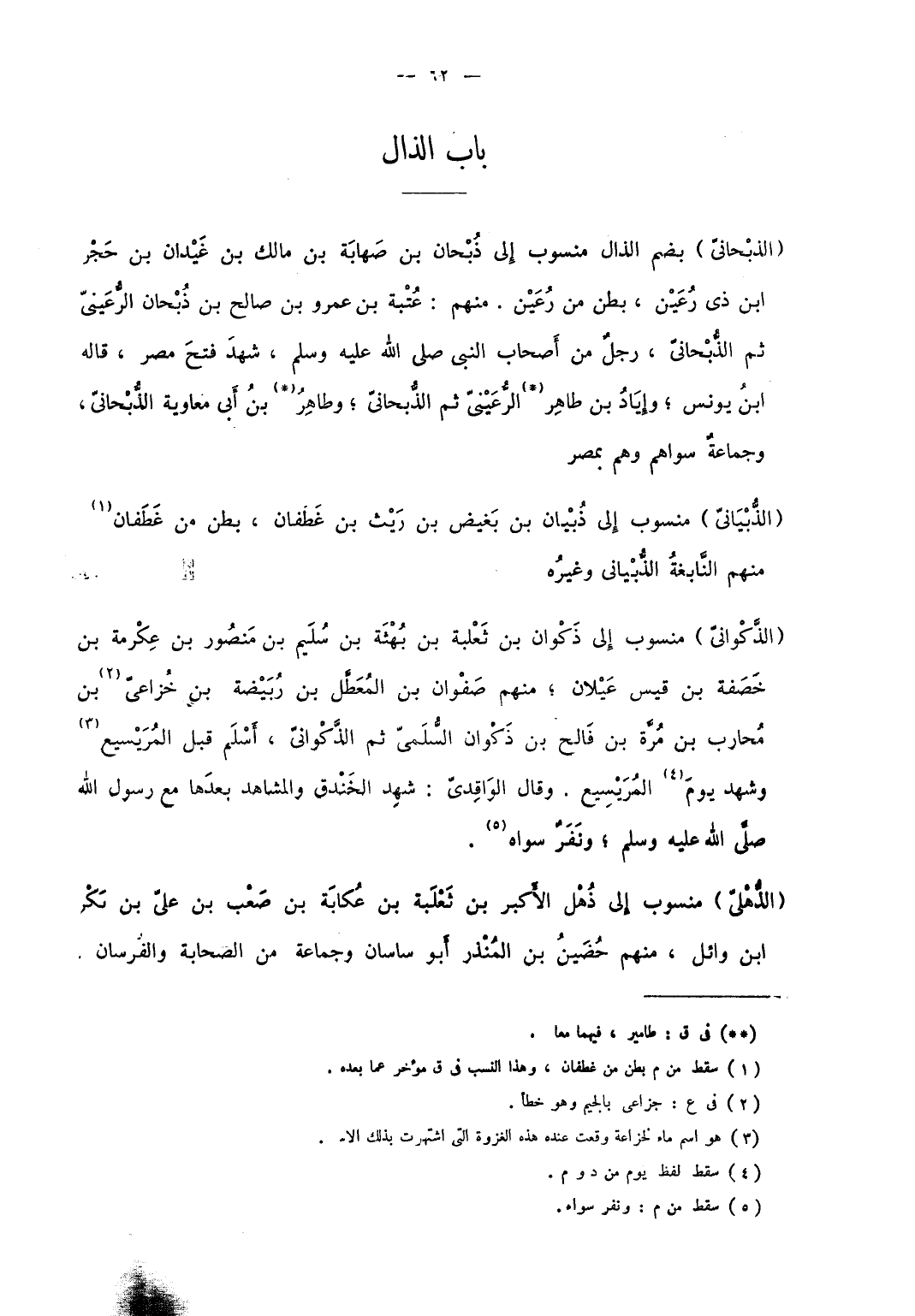 الذُّبْحاني بضم الذال منسوب إلى ذُبْحَان بن صهابة بن مالك بن غيدان بن حجر ابن ذي رُعين، بطن من رُعين. منهم: عُتبة بن عمرو بن صالح بن ذُبحان الرُّعيني ثم الذُّبحاني، رجل من أصحاب النبي صلى الله عليه وسلم، شهد فتح مصر، قاله ابن يونس؛ وإيادُ بن طاهر الرُّعيني ثم الذُّبحاني؛ وطاهر بن ابن معاوية الذُّبحاني، وجماعة سواهم وهم بمصر.