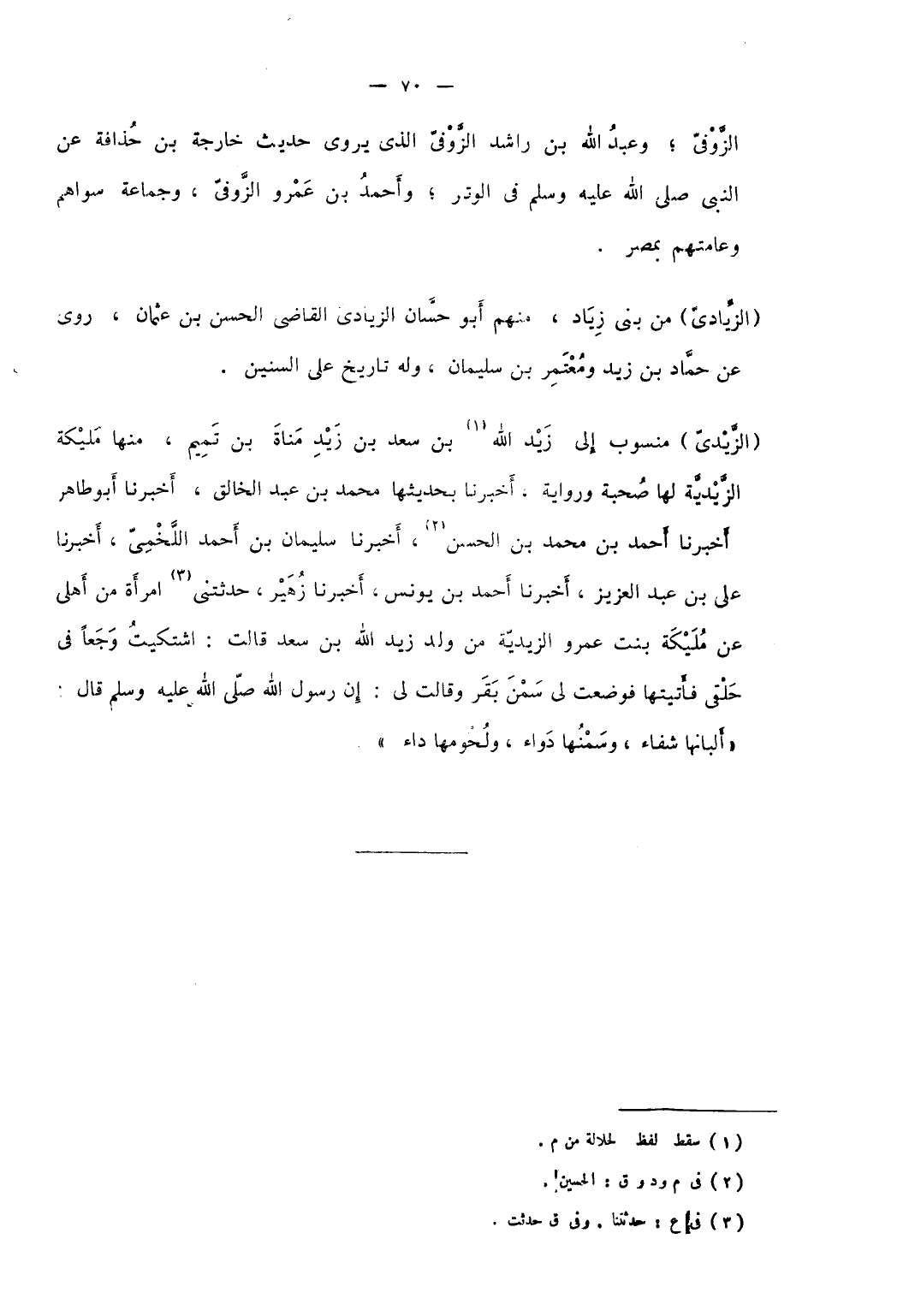 الزَّيدي منسوب إلى زيد الله بن سعد بن زيد مناة بن تَميم، منها مُلَيْكَة الزَّيديَّة لها صُحبة ورواية، أخبرنا بحديثها محمد بن عبد الخالق، أخبرنا أبو طاهر أخبرنا أحمد بن محمد بن الحسن، أخبرنا سليمان بن أحمد اللخمي، أخبرنا علي بن عبد العزيز، أخبرنا أحمد بن يونس، أخبرنا زُهَير حدَّثَتني امرأة من أهلي عن مُلَيْكَة بنت عمرو الزيدية من ولد زيد الله بن سعد قالت: اشتكيتُ وَجَعا في حَلقي فأتيتها فوضعت لي سَمْنَ بَقَرَ وقالت لي: إن رسول الله صلى الله عليه وسلم قال: ألبانها شفاء، وسمنها دواء، ولحومها داء.