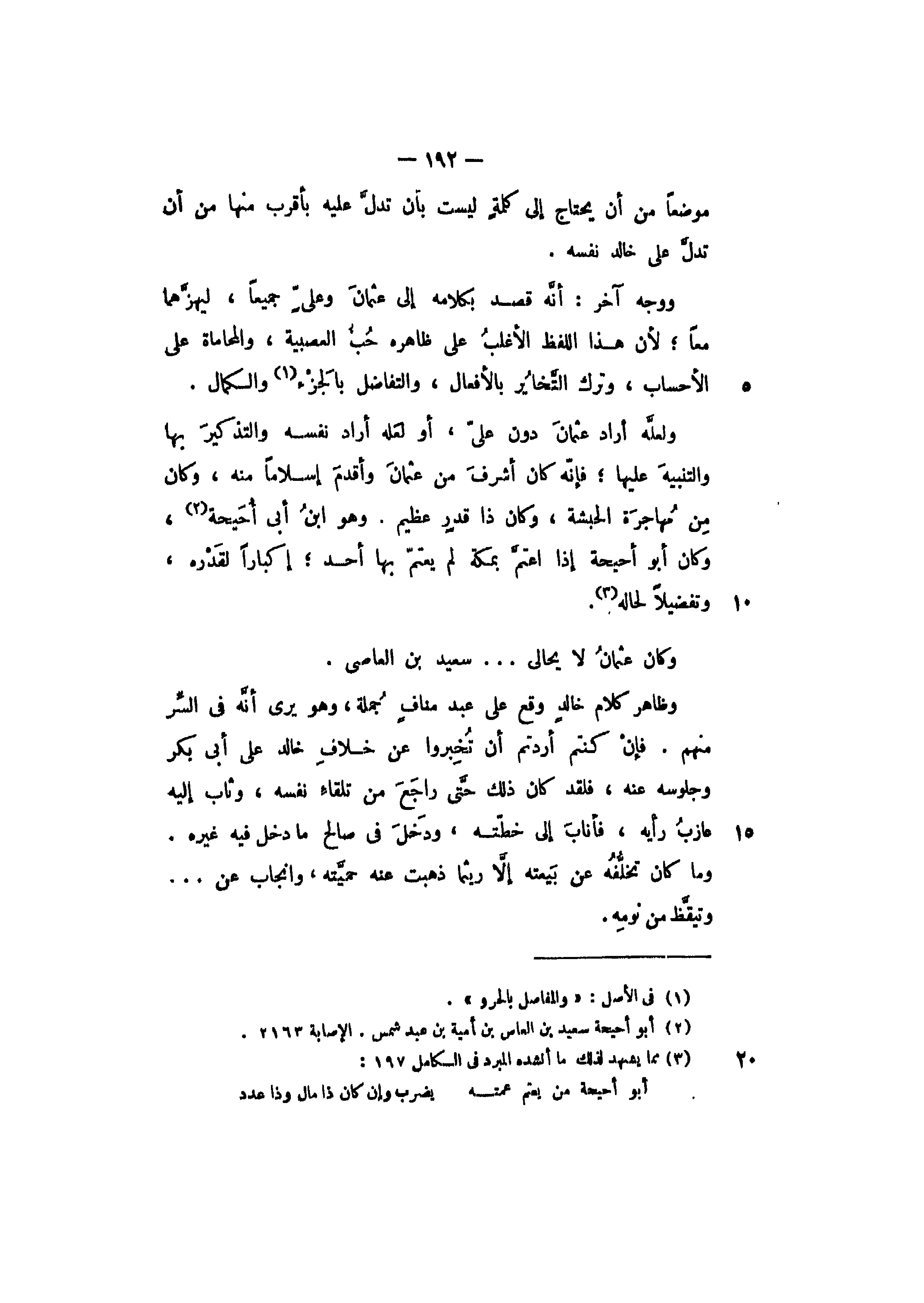 ولعله أراد عثمان دون علي، أو لعله أراد نفسه والتذكير بها والتنبيه عليها، فإنه كان أشرف من عثمان وأقدم إسلاما منه، وكان من مهاجرة الحبشة، وكان ذا قدر عظيم، وهو ابن أبي أحيحة. وكان أبو أحيحة إذا اعتم بمكة لم يعتم بها أحد، إكبارا لقدره وتفضيلا لحاله.