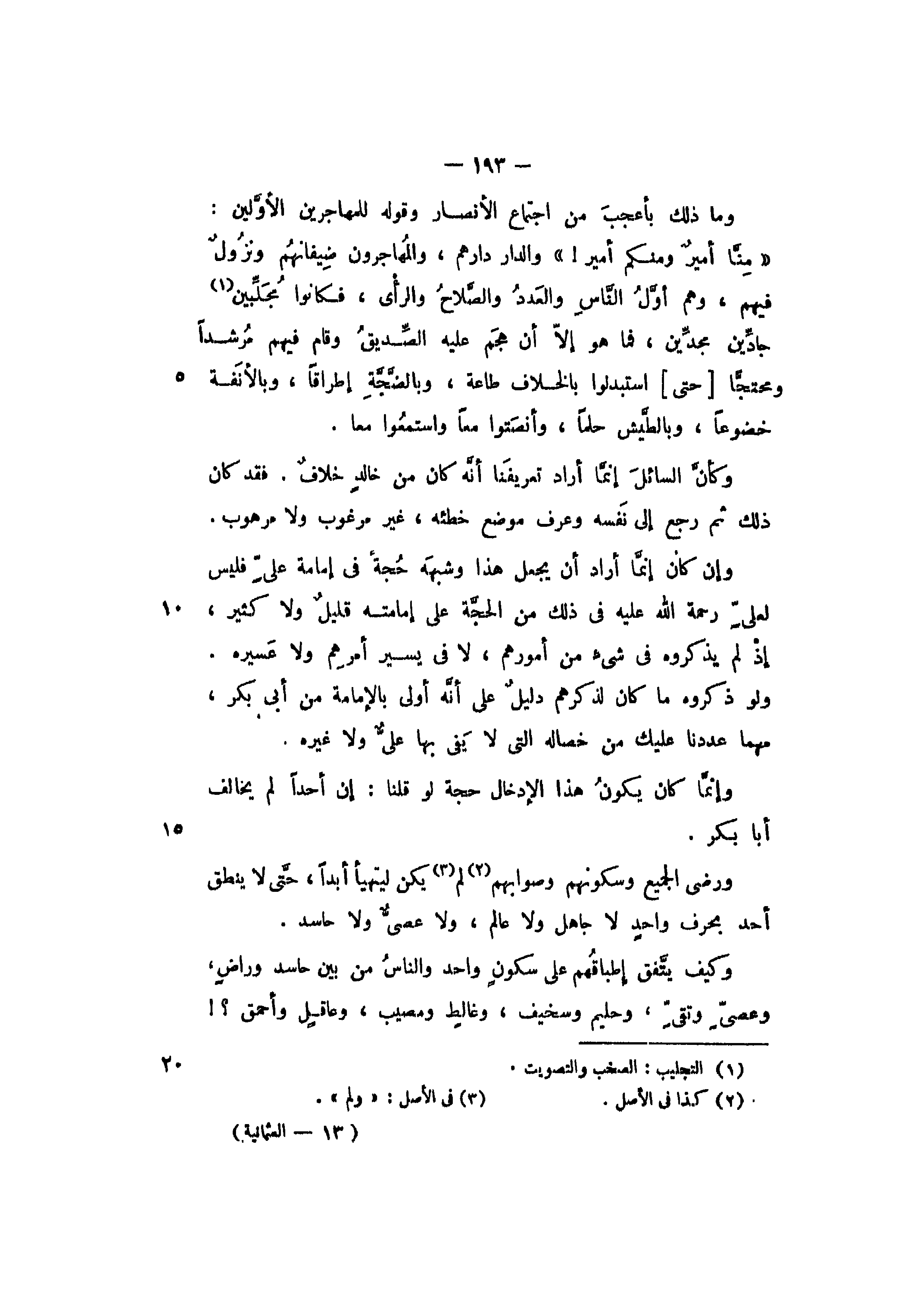 وما ذلك بأعجب من اجتماع الأنصار وقوله للمهاجرين الأولين: "منا أمير ومنكم أمير"، والدار دارهم، والمهاجرون ضيفانهم ونزول فيهم. وهم أول الناس والعدد والصلاح والرأي، فكانوا مجلبين جادين مجدين، فما هو إلا أن هجم عليه الصديق وقام فيهم مرشدا ومحتجا، [حتى] استبدلوا بالخلاف طاعة، وبالضجة إطراقا، وبالأنفة خضوعا، وبالطيش حلما، وأنصتوا معا واستمعوا معا.