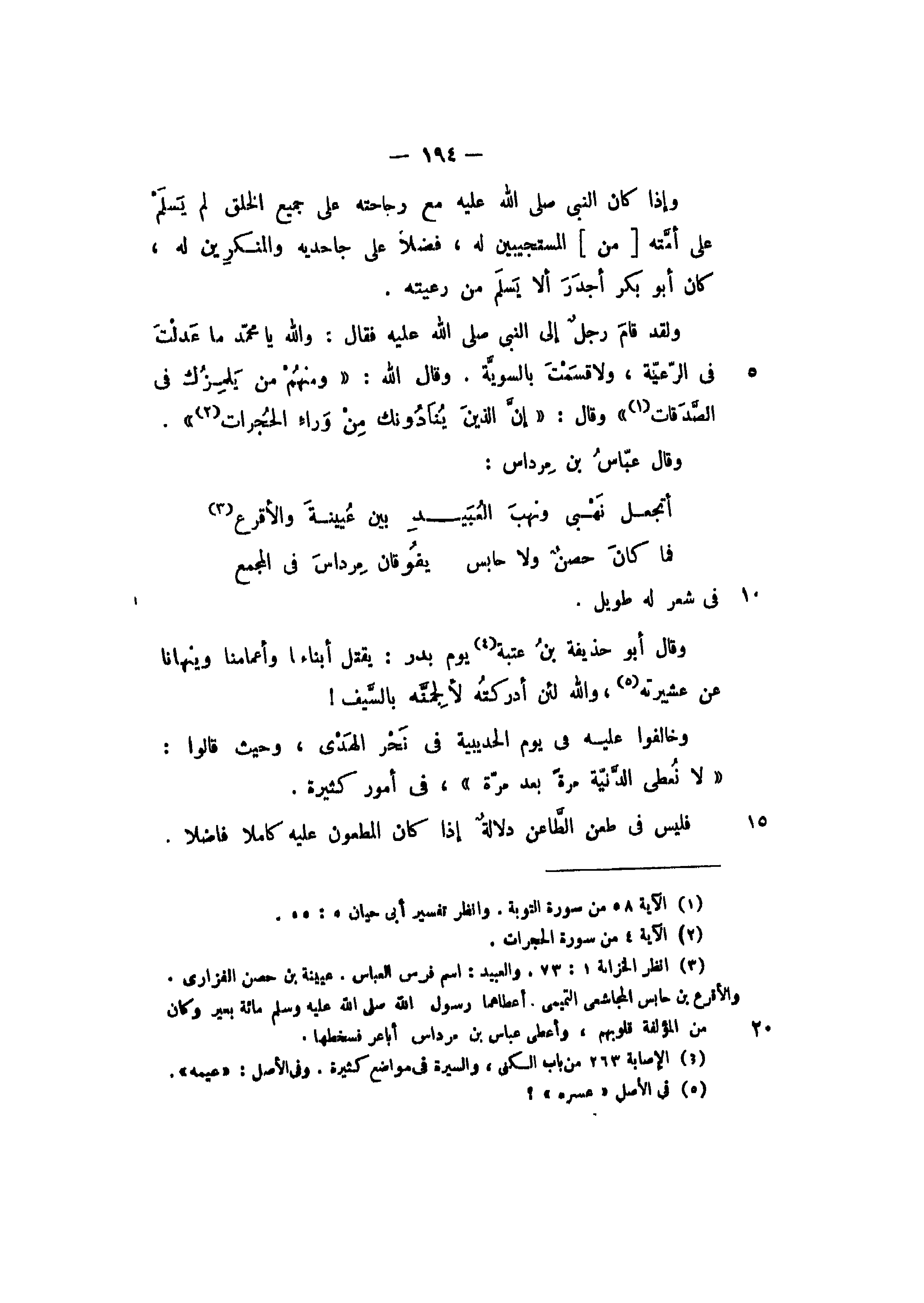 ولقد قام رجل إلى النبي - صلى الله عليه - فقال: والله يا محمد ما عدلت في الرعية، ولا قسمت بالسوية. وقال الله: {ومنهم من يلمزك في الصدقات} وقال: {إن الذين ينادونك من وراء الحجرات}.