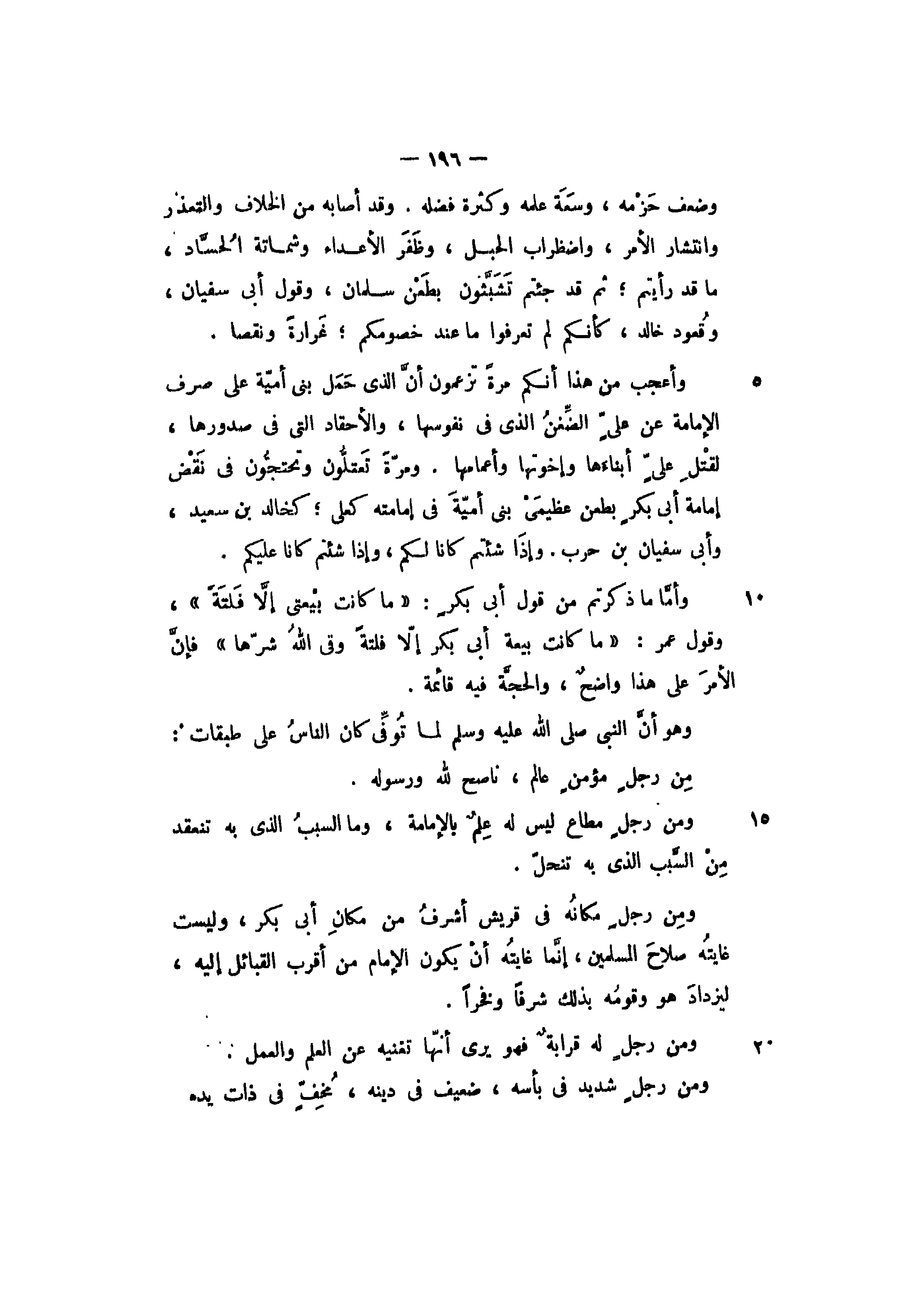 وأعجب من هذا أنكم مرة تزعمون أن الذي حمل بني أمية على صرف الإمامة عن علي الضغن الذي في نفوسها، والأحقاد التي في صدورها، لقتل علي أبناءها وإخوتها وأعمامها. ومرة تعتلون وتحتجون في نقض إمامة أبي بكر بطعن عظيمي بني أمية في إمامته كعلي، كخالد بن سعيد وأبي سفيان بن حرب. وإذا شئتم كانا لكم، وإذا شئتم كانا عليكم.