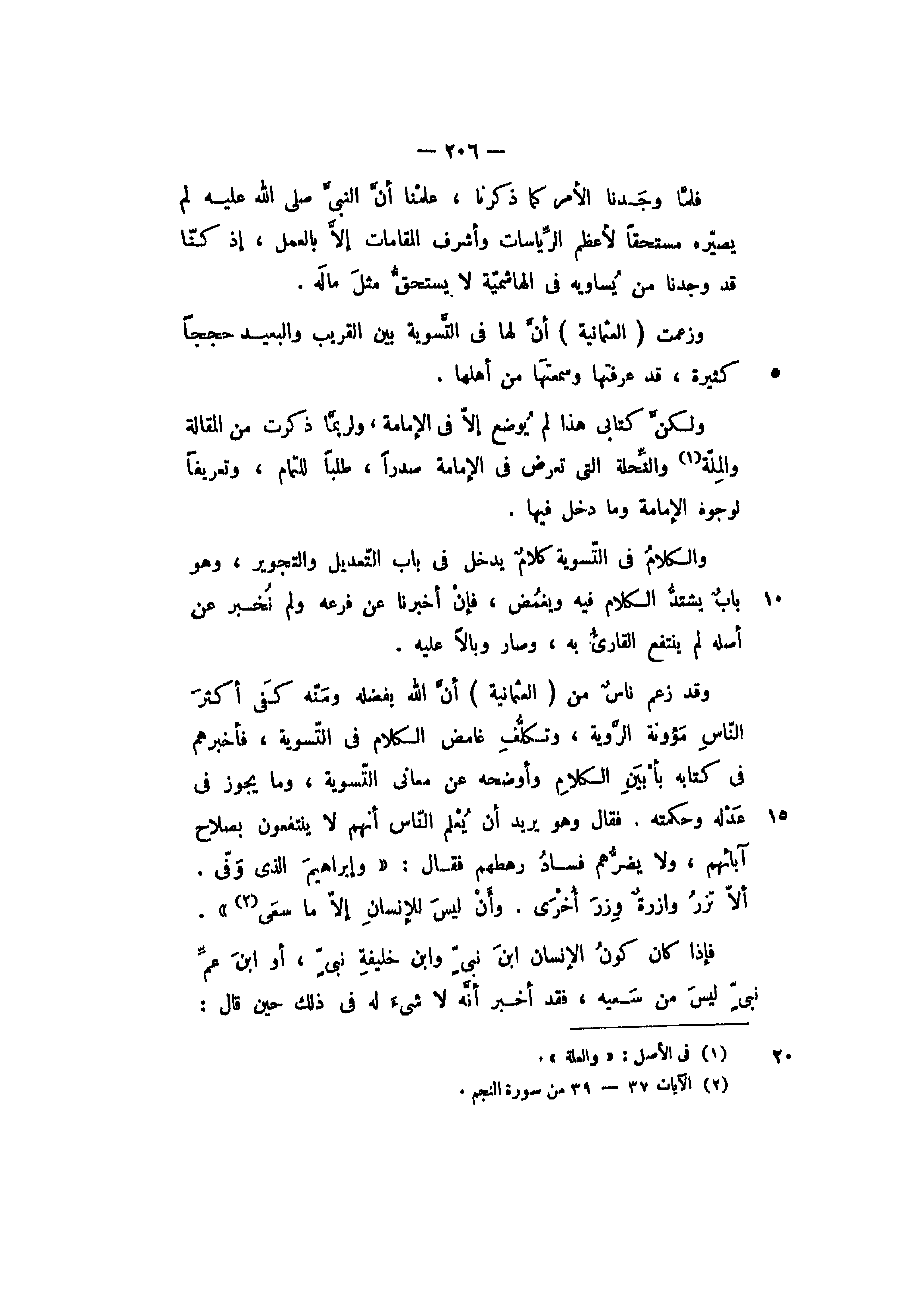 وقد زعم ناس من العثمانية أن الله بفضله ومنه كفى أكثر الناس مؤونة الروية، وتكلف غامض الكلام في التسوية، فأخبرهم في كتابه بأبين الكلام وأوضحه عن معاني التسوية، وما يجوز في عدله وحكمته. فقال وهو يريد أن يعلم الناس أنهم لا ينتفعون بصلاح آبائهم، ولا يضرهم فساد رهطهم فقال: {وإبراهيم الذي وفي. ألا تزر وازرة وزر أخرى. وأن ليس للإنسان إلا ما سعى}.