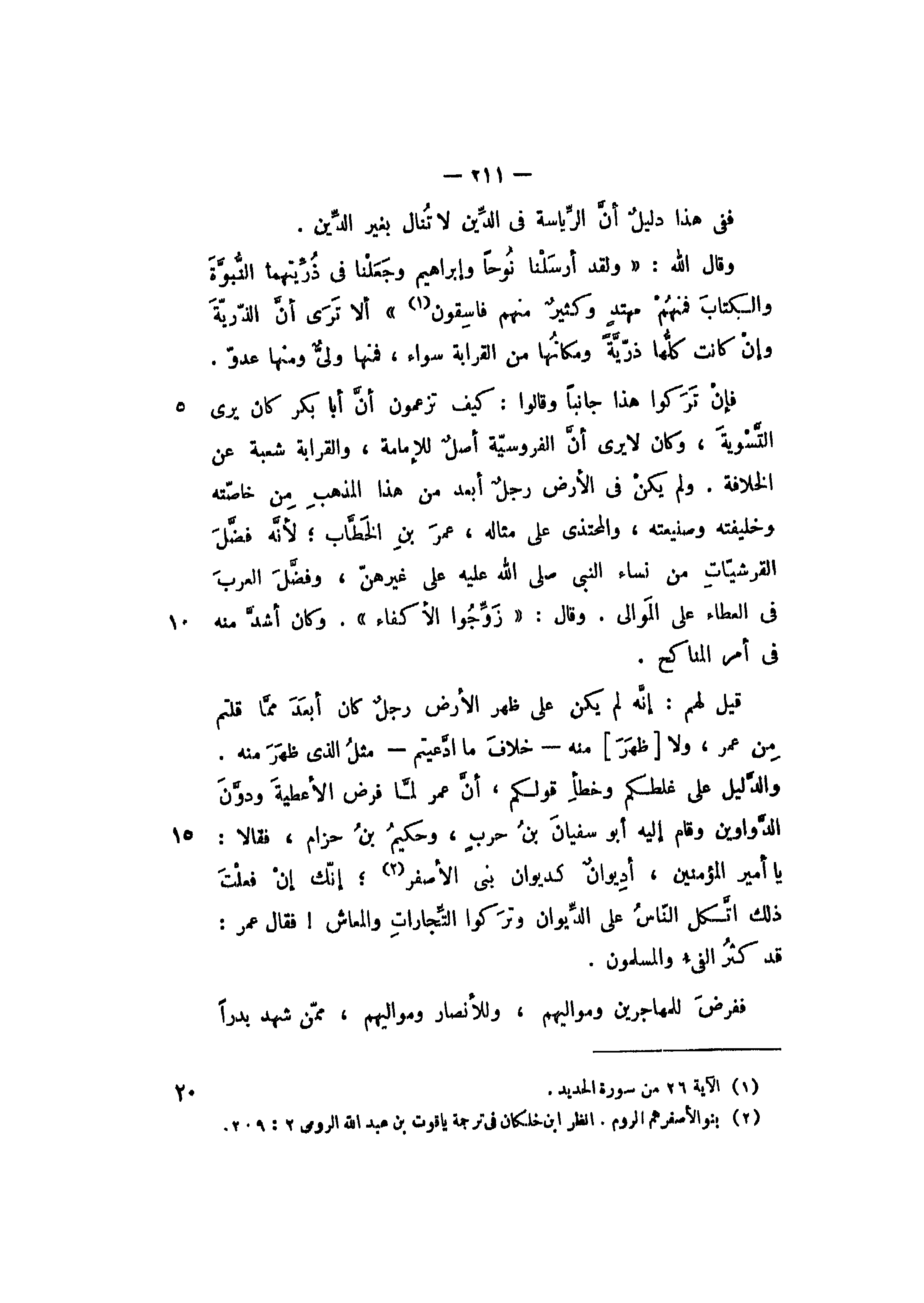 والدليل على غلطكم وخطأ قولكم، أن عمر لما فرض الأعطية ودون الدواوين وقام إليه أبو سفيان بن حرب وحكيم بن حزام، فقالا: يا أمير المؤمنين، أديوان كديوان بني الأصفر، إنك إن فعلت ذلك اتكل الناس على الديوان وتركوا التجارات والمعاش! فقال عمر: قد كثر الفئ والمسلمون.