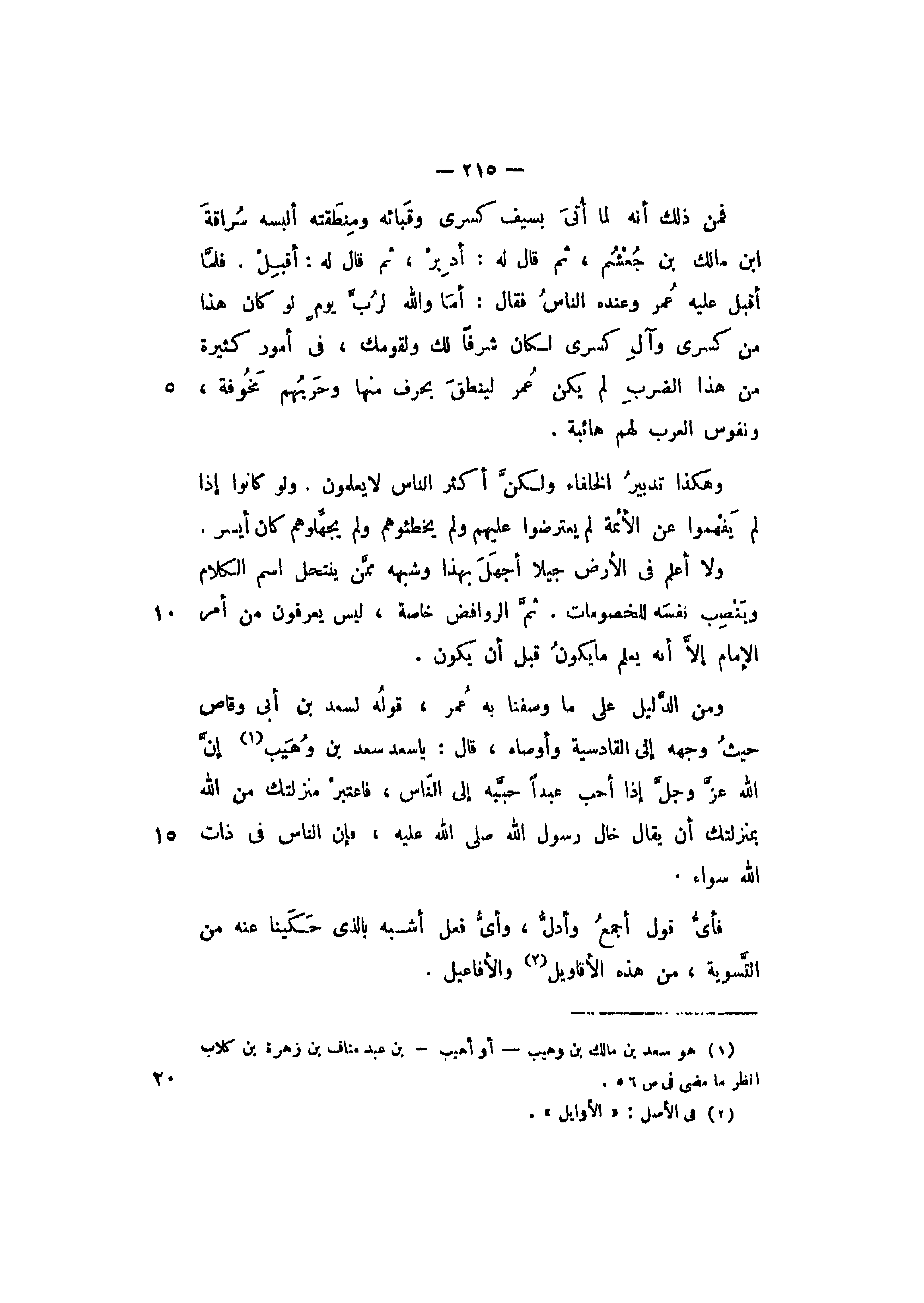 ومن الدليل على ما وصفنا به عمر، قوله لسعد بن أبي وقاص حيث وجهه إلى القادسية وأوصاه، قال: يا سعد سعد بن وهيب، إن الله عز وجل إذا أحب عبدا حببه إلى الناس، فاعتبر منزلتك من الله بمنزلتك أن يقال خال رسول الله - صلى الله عليه -، فإن الناس في ذات الله سواء.