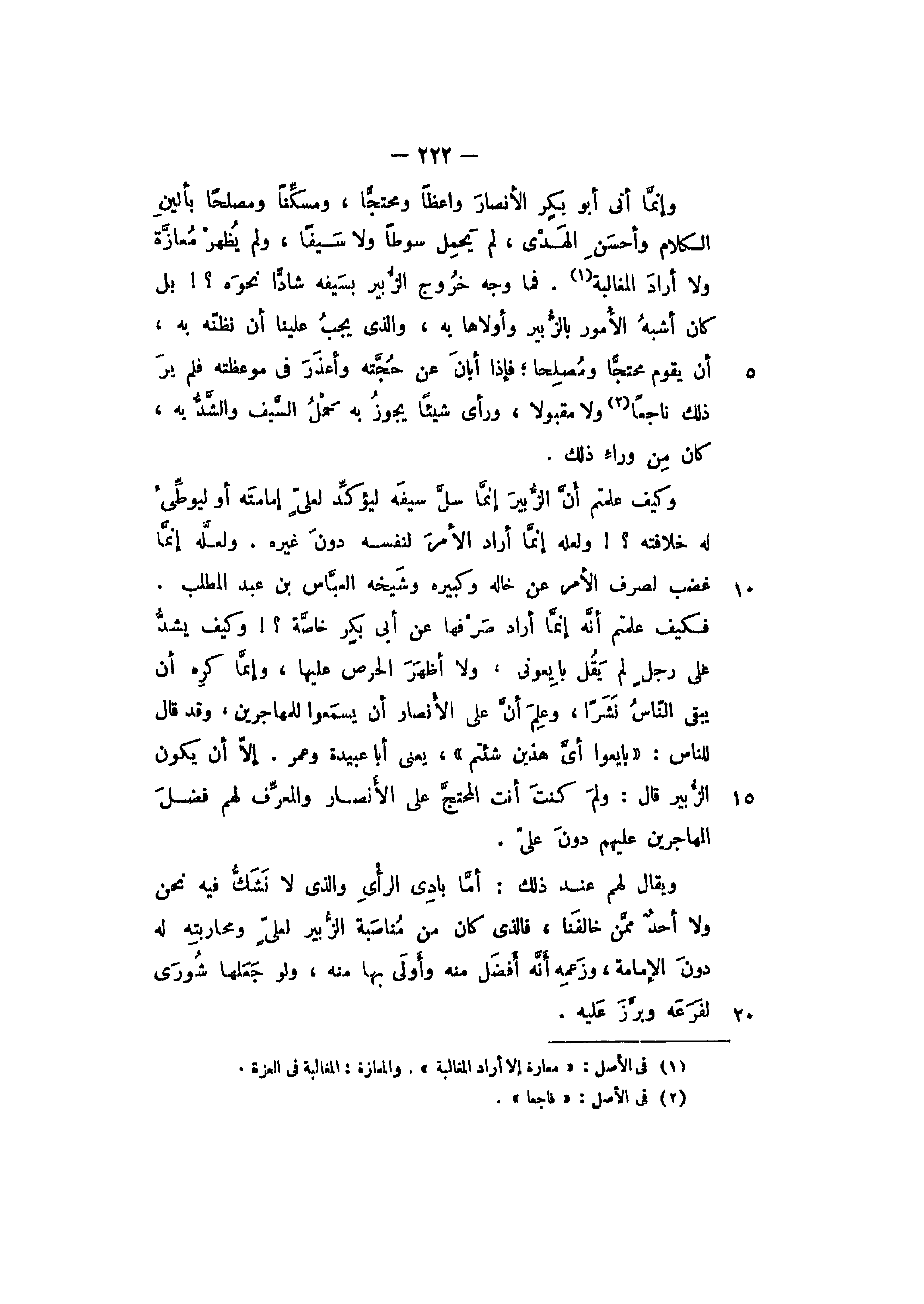 وإنما أتى أبو بكر الأنصار واعظا ومحتجا، ومسكنا ومصلحا بألين الكلام وأحسن الهدي، لم يحمل سوطا ولا سيفا، ولم يظهر معازة ولا أراد المغالبة. فما وجه خروج الزبير بسيفه شادا نحوه؟ بل كان أشبه الأمور بالزبير وأولاها به، والذي يجب علينا أن نظنه به، أن يقوم محتجا ومصلحا. فإذا أبان عن حجته وأعذر في موعظته فلم ير ذلك ناجعا ولا مقبولا، ورأى شيئا يجوز به حمل السيف والشد به، كان من وراء ذلك.