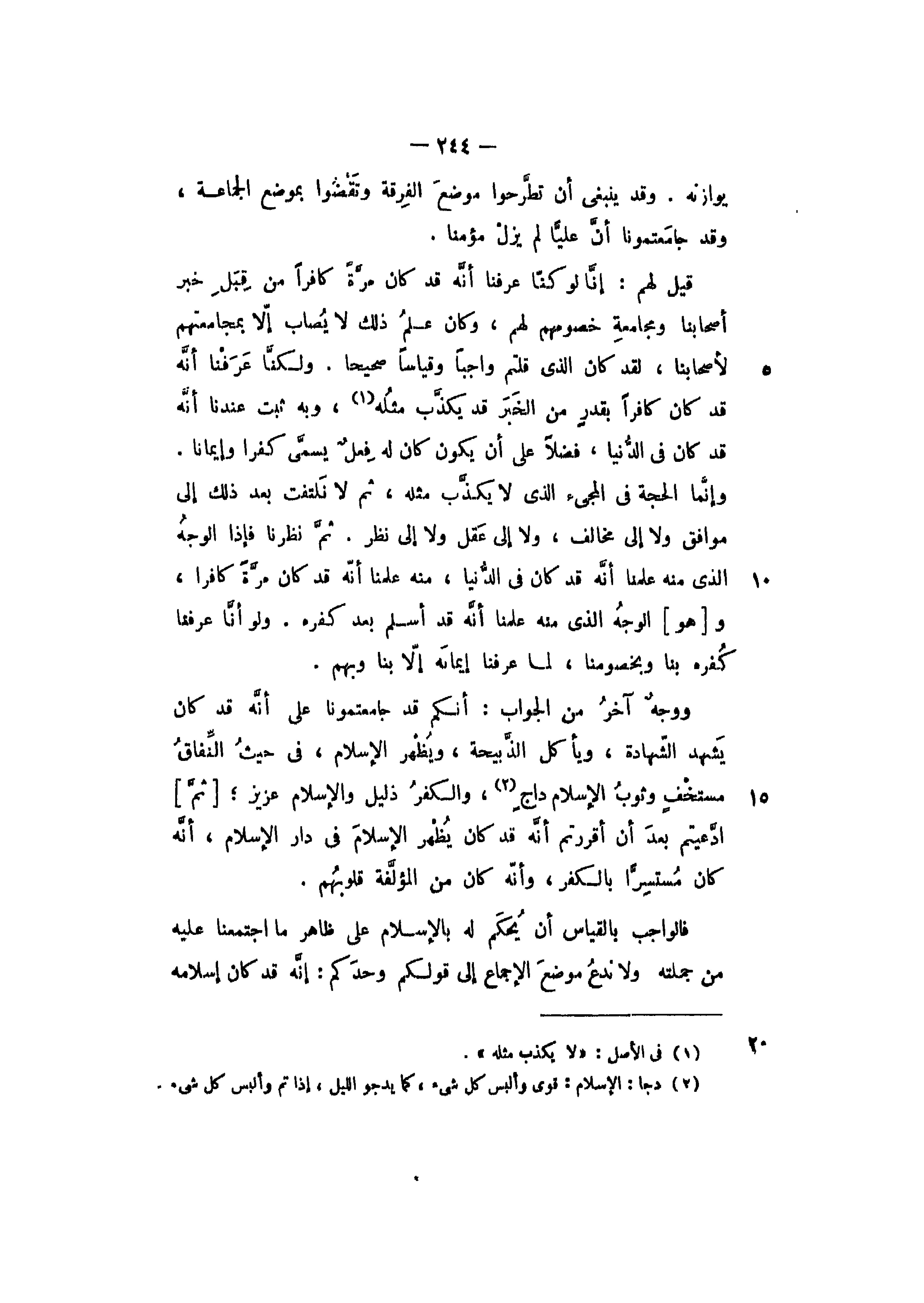 قيل لهم: إنا لو كنا عرفنا أنه قد كان مرة كافرا من قبل خبر أصحابنا ومجامعة خصومهم لهم، وكان علم ذلك لا يصاب إلا بمجامعتهم لأصحابنا، لقد كان الذي قلتم واجبا وقياسا صحيحا. ولكنا عرفنا أنه قد كان كافرا بقدر من الخبر قد يكذب مثله، وبه ثبت عندنا أنه قد كان في الدنيا، فضلا على أن يكون كان له فعل يسمى كفرا وإيمانا. وإنما الحجة في المجئ الذي لا يكذب مثله، ثم لا نلتفت بعد ذلك إلى موافق ولا إلى مخالف، ولا إلى عقل ولا إلى نظر. ثم نظرنا فإذا الوجه الذي منه علمنا أنه قد كان في الدنيا، منه علمنا أنه قد كان مرة كافرا، و [هو] الوجه الذي منه علمنا أنه قد أسلم بعد كفره. ولو أنا عرفنا كفره بنا وبخصومنا، لما عرفنا إيمانه إلا بنا وبهم.