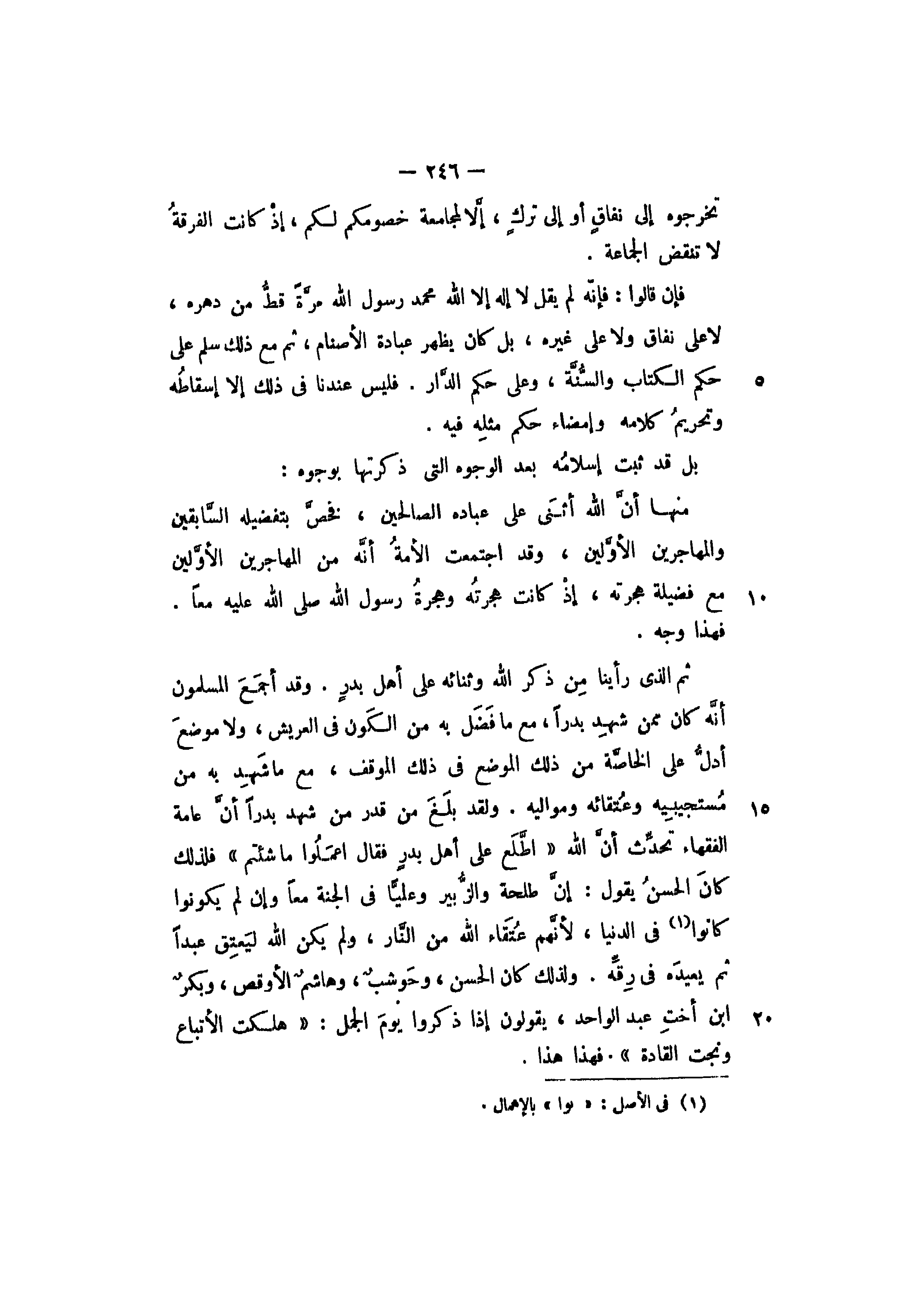 ثم الذي رأينا من ذكر الله وثنائه على أهل بدر. وقد أجمع المسلمون أنه كان ممن شهد بدرا، مع ما فضل من الكون في العريش، ولا موضع أدل على الخاصة من ذلك الموضع في ذلك الموقف، مع ما شهد به من مستجيبيه وعتقائه ومواليه، ولقد بلغ من قدر من شهد بدرا أن عامة الفقهاء تحدث: "أن الله اطلع على أهل بدر فقال اعملوا ما شئتم" فلذلك كان الحسن يقول: إن طلحة والزبير وعليا في الجنة معا وإن لم يكونوا كانوا في الدنيا، لأنهم عتقاء الله من النار، ولم يكن الله ليعتق عبدا ثم يعيده في رقه. ولذلك كان الحسن وحوشب وهاشم الأوقص وبكر ابن أخت عبد الواحد يقولون إذا ذكروا يوم الجمل: "هلكت الأتباع ونجت القادة". فهذا هذا.