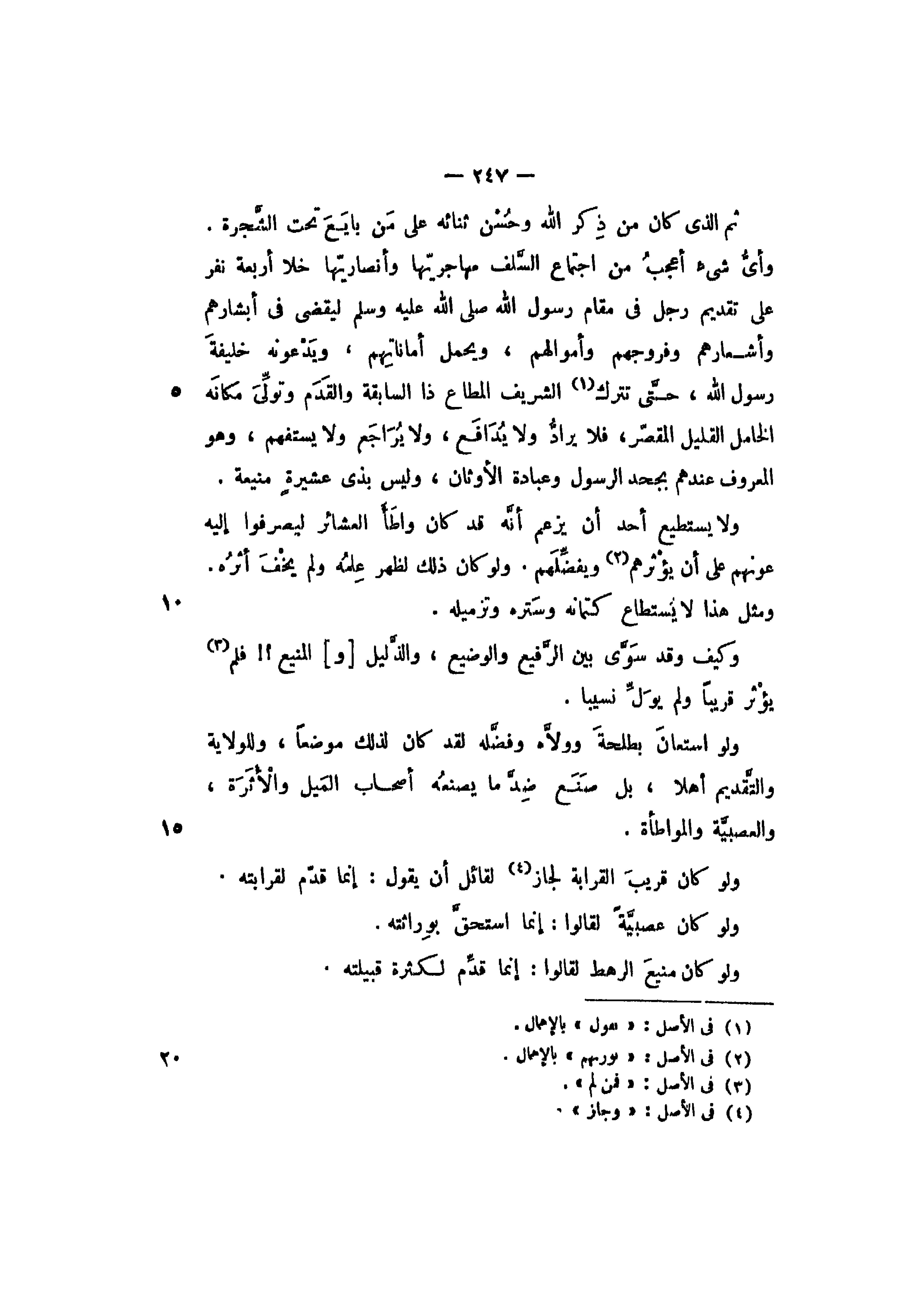 وأي شئ أعجب من اجتماع السلف مهاجريها وأنصاريها خلا أربعة نفر على تقديم رجل في مقام رسول الله - صلى الله عليه وسلم - ليقضي في أبشارهم وأشعارهم، وفروجهم وأموالهم، ويحمل أماناتهم، ويدعونه خليفة رسول الله، حتى تترك الشريف المطاع ذا السابقة والقدم وتولي مكانه الخامل القليل المقصر، فلا يراد ولا يدافع، ولا يراجع ولا يستفهم، وهو المعروف عندهم بجحد الرسول وعبادة الأوثان، وليس بذي عشيرة منيعة.
