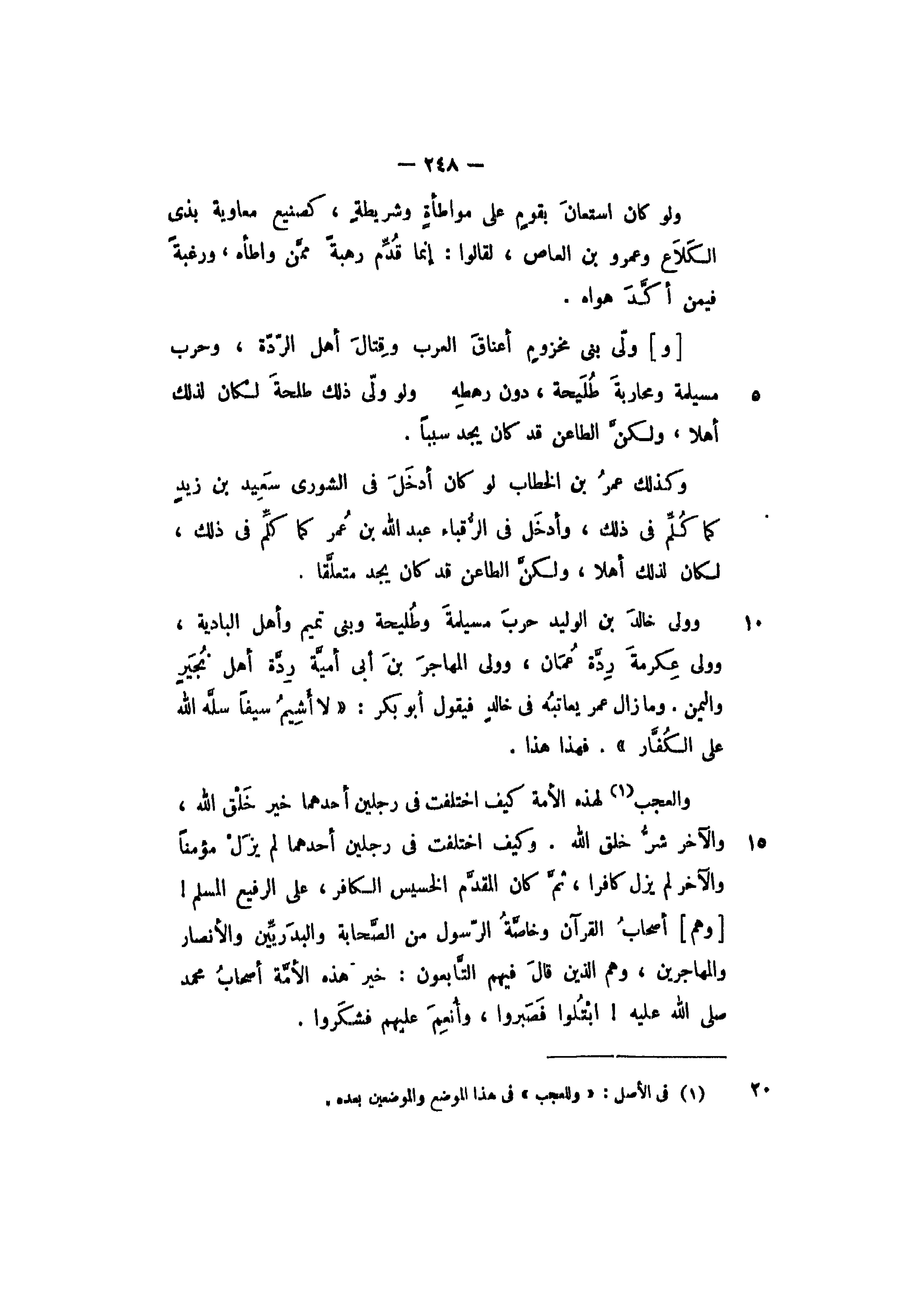[و] ولى بني مخزوم أعناق العرب وقتال أهل الردة، وحرب مسيلمة ومحاربة طليحة، دون رهطه. ولو ولى ذلك طلحة لكان لذلك أهلا، ولكن الطاعن قد كان يجد سببا.